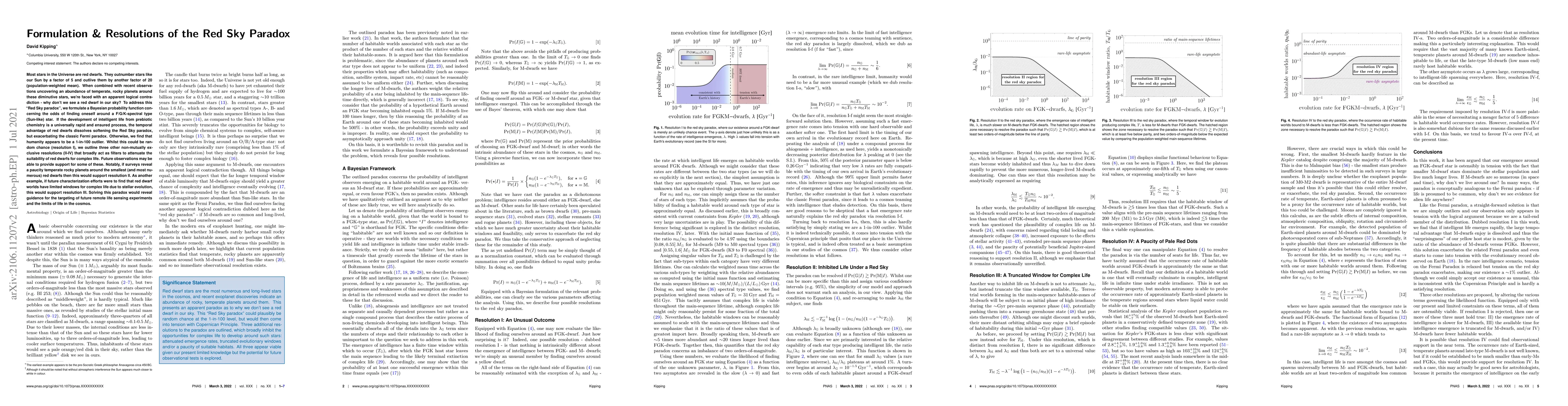 The Red Sky Paradox questions why red dwarfs, more numerous and long-lived than Sun-like stars, are not seen in our sky. The paper proposes Bayesian methods to evaluate the likelihood of finding oneself near a Sun-like star, suggesting humanity may be an outlier. It offers four resolutions, including the lack of temperate planets around red dwarfs and limited windows for life due to stellar evolution, to explain this paradox.