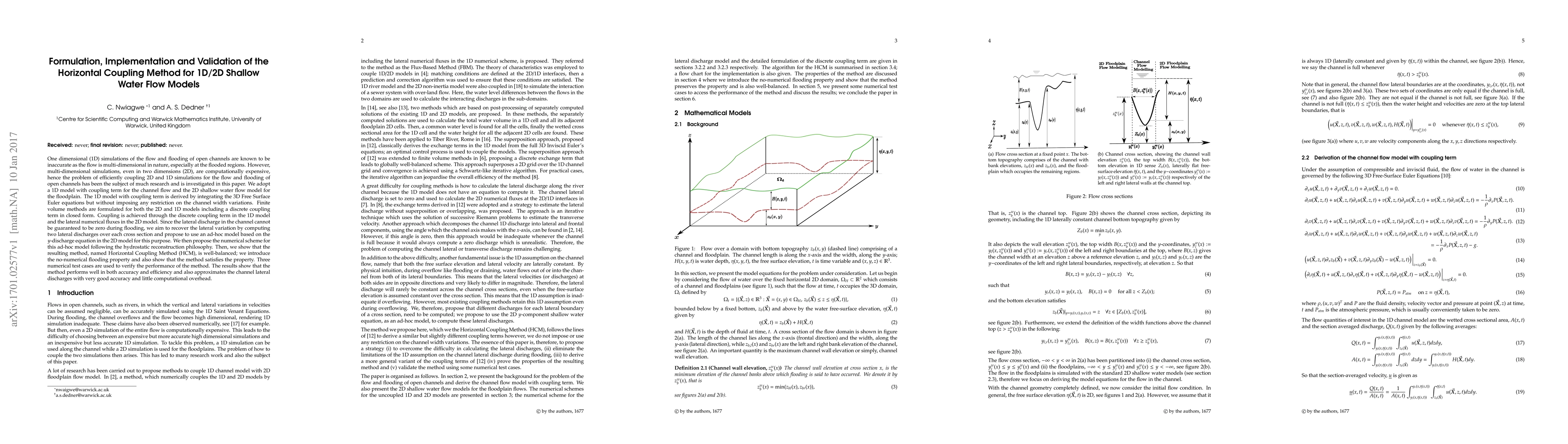 One dimensional (1D) simulations of the flow and flooding of open channels are known to be inaccurate as the flow is multi-dimensional in nature, especially at the flooded regions. However, multi-dimensional simulations, even in two dimensions (2D), are computationally expensive, hence the problem of efficiently coupling 2D and 1D simulations for the flow and flooding of open channels has been the subject of much research and is investigated in this paper. We adopt a 1D model with coupling term for the channel flow and the 2D shallow water flow model for the floodplain. The 1D model with coupling term is derived by integrating the 3D Free Surface Euler equations but without imposing any restriction on the channel width variations. %leading to a new coupling term. Finite volume methods are formulated for both the 2D and 1D models including a discrete coupling term in closed form. Coupling is achieved through the discrete coupling term in the 1D model and the lateral numerical fluxes in the 2D model. Since the lateral discharge in the channel cannot be guaranteed to be zero during flooding, we aim to recover the lateral variation by computing two lateral discharges over each cross section and propose to use an ad-hoc model based on the $y$-discharge equation in the 2D model for this purpose. We then propose the numerical scheme for this ad-hoc model following the hydrostatic reconstruction philosophy. Then, we show that the resulting method, named Horizontal Coupling Method (HCM), is well-balanced; we introduce the no-numerical flooding property and also show that the method satisfies the property. Three numerical test cases are used to verify the performance of the method. The results show that the method performs well in both accuracy and efficiency and also approximates the channel lateral discharges with very good accuracy and little computational overhead.