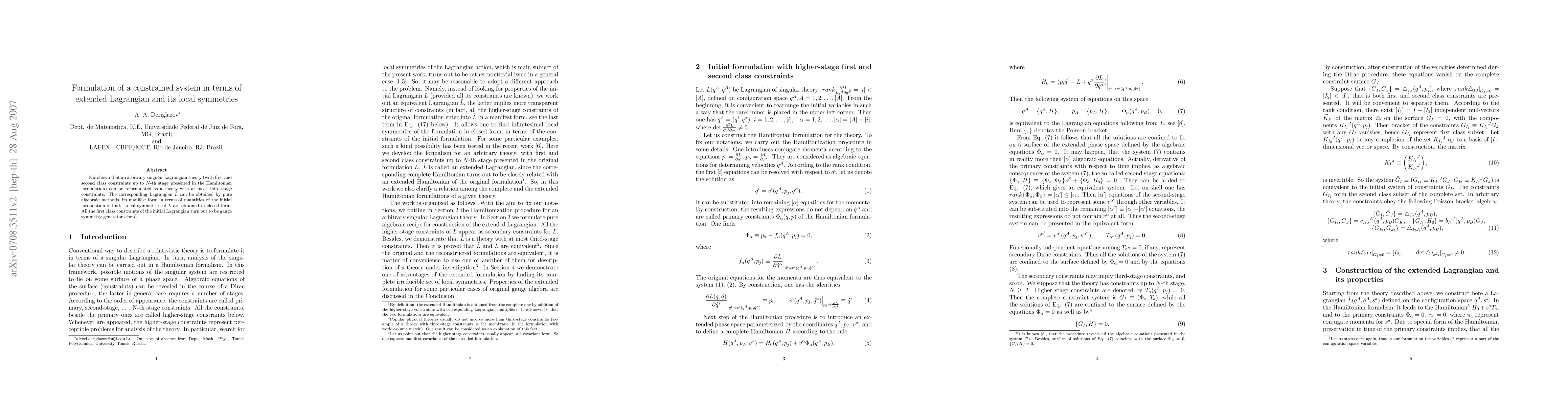 This paper reformulates a singular Lagrangian theory with high-order constraints into one with only third-stage constraints using an extended Lagrangian approach. The reformulated Lagrangian $\tilde L$ retains the symmetries of the original theory, with first-class constraints becoming gauge symmetry generators.