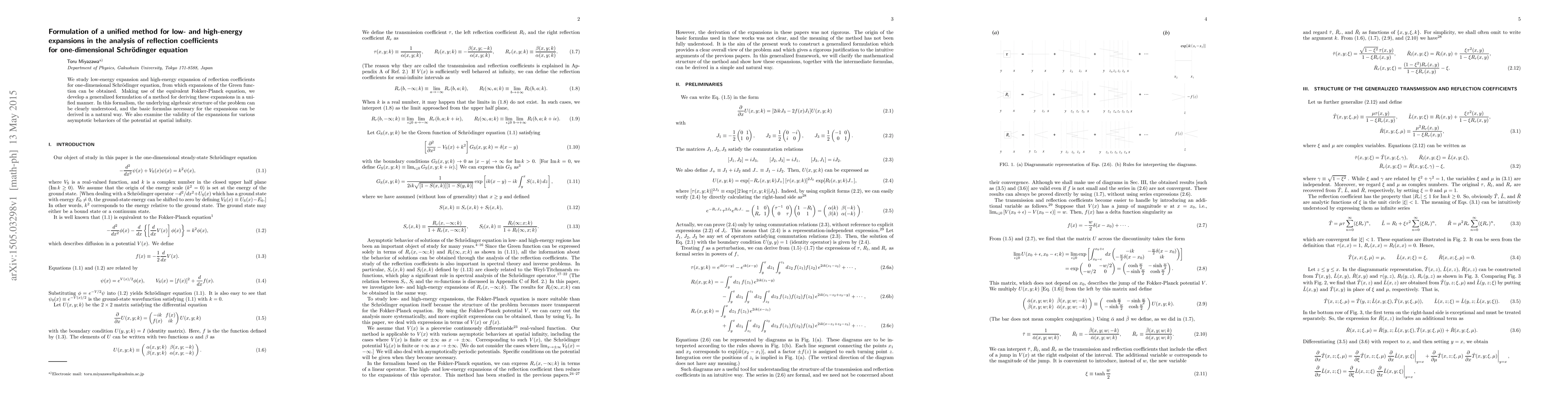 We study low-energy expansion and high-energy expansion of reflection coefficients for one-dimensional Schr\"odinger equation, from which expansions of the Green function can be obtained. Making use of the equivalent Fokker-Planck equation, we develop a generalized formulation of a method for deriving these expansions in a unified manner. In this formalism, the underlying algebraic structure of the problem can be clearly understood, and the basic formulas necessary for the expansions can be derived in a natural way. We also examine the validity of the expansions for various asymptotic behaviors of the potential at spatial infinity.