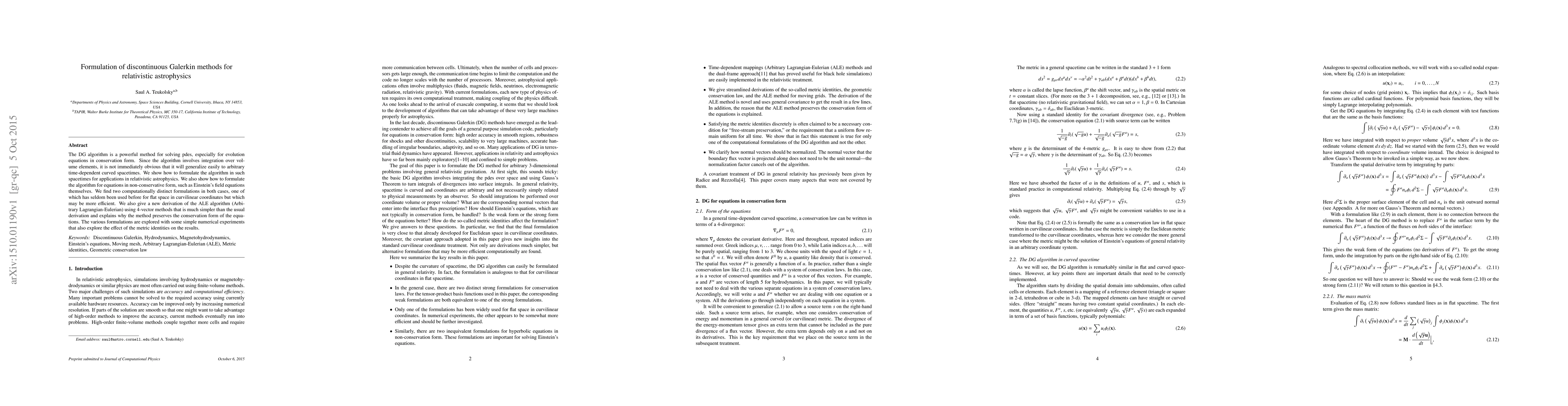This paper presents a formulation of discontinuous Galerkin (DG) methods for relativistic astrophysics in curved spacetimes, applicable to both conservation and non-conservative equations like Einstein's field equations. It introduces two computationally distinct formulations, one potentially more efficient for flat space in curvilinear coordinates. The paper also provides a simplified derivation of the ALE algorithm, preserving conservation form, and examines these formulations through numerical experiments, exploring the impact of metric identities.