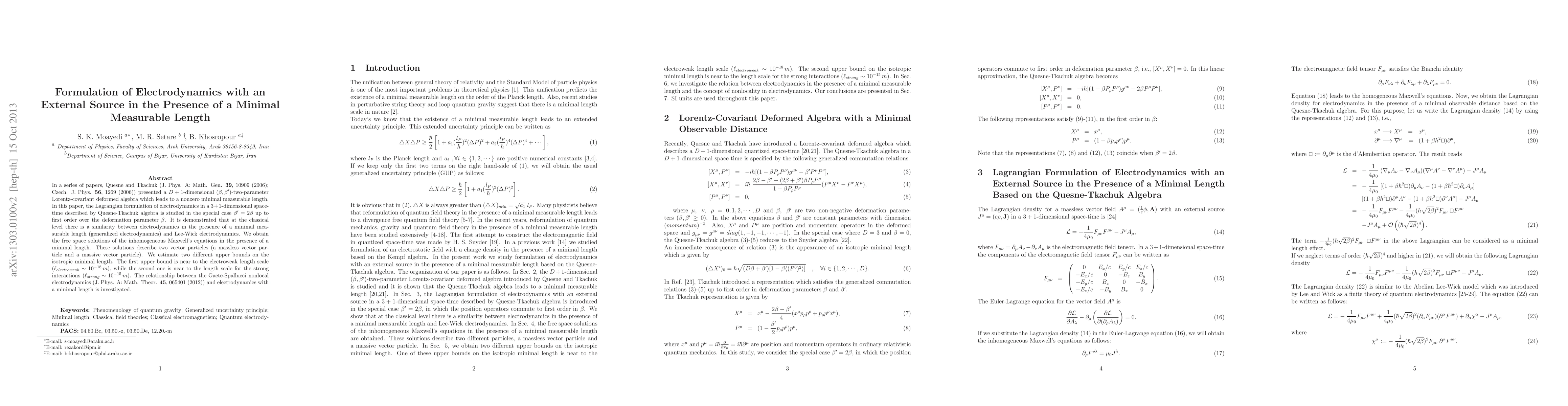 In a series of papers, Quesne and Tkachuk (J. Phys. A: Math. Gen. \textbf{39}, 10909 (2006); Czech. J. Phys. \textbf{56}, 1269 (2006)) presented a $D+1$-dimensional $(\beta,\beta')$-two-parameter Lorentz-covariant deformed algebra which leads to a nonzero minimal measurable length. In this paper, the Lagrangian formulation of electrodynamics in a 3+1-dimensional space-time described by Quesne-Tkachuk algebra is studied in the special case $\beta'=2\beta$ up to first order over the deformation parameter $\beta$. It is demonstrated that at the classical level there is a similarity between electrodynamics in the presence of a minimal measurable length (generalized electrodynamics) and Lee-Wick electrodynamics. We obtain the free space solutions of the inhomogeneous Maxwell's equations in the presence of a minimal length. These solutions describe two vector particles (a massless vector particle and a massive vector particle). We estimate two different upper bounds on the isotropic minimal length. The first upper bound is near to the electroweak length scale $(\ell_{electroweak}\sim 10^{-18}\, m)$, while the second one is near to the length scale for the strong interactions $(\ell_{strong}\sim 10^{-15}\, m)$. The relationship between the Gaete-Spallucci nonlocal electrodynamics (J. Phys. A: Math. Theor. \textbf{45}, 065401 (2012)) and electrodynamics with a minimal length is investigated.