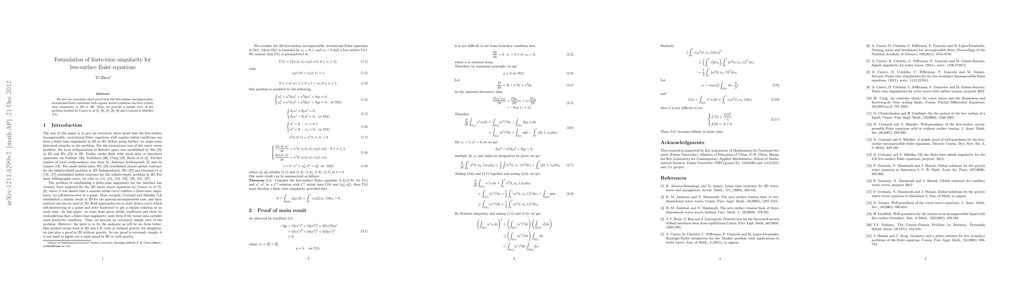The free-surface incompressible Euler equations can form a finite-time singularity in 2D or 3D under certain conditions, providing insight into the behavior of fluid dynamics.