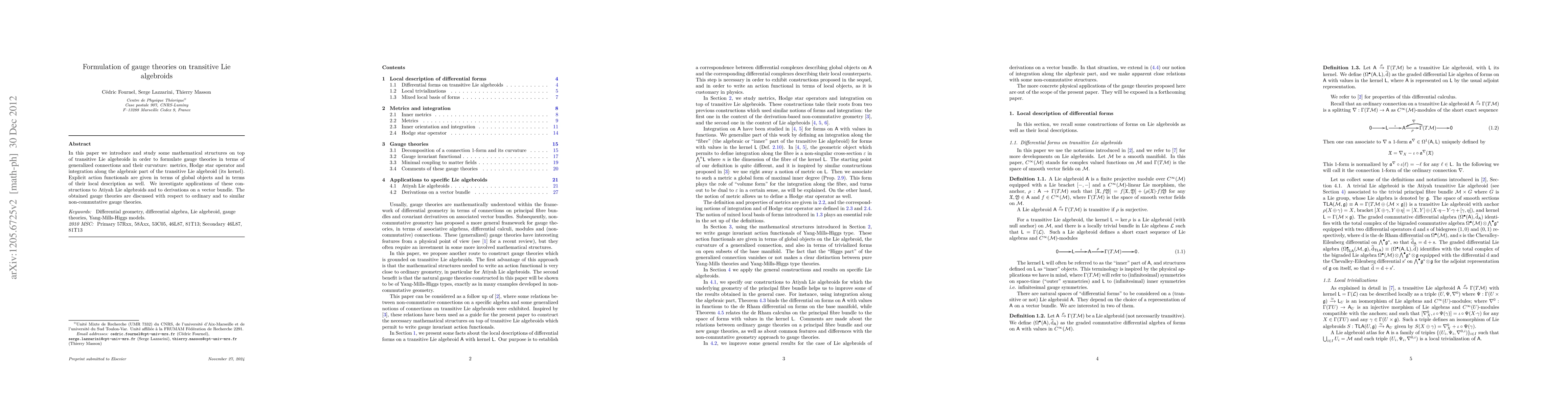 This paper formulates gauge theories on transitive Lie algebroids using generalized connections and curvature, incorporating metrics, Hodge star operator, and integration along the kernel. It provides explicit action functionals and applies these constructions to Atiyah Lie algebroids and vector bundle derivations, comparing with ordinary and non-commutative gauge theories.