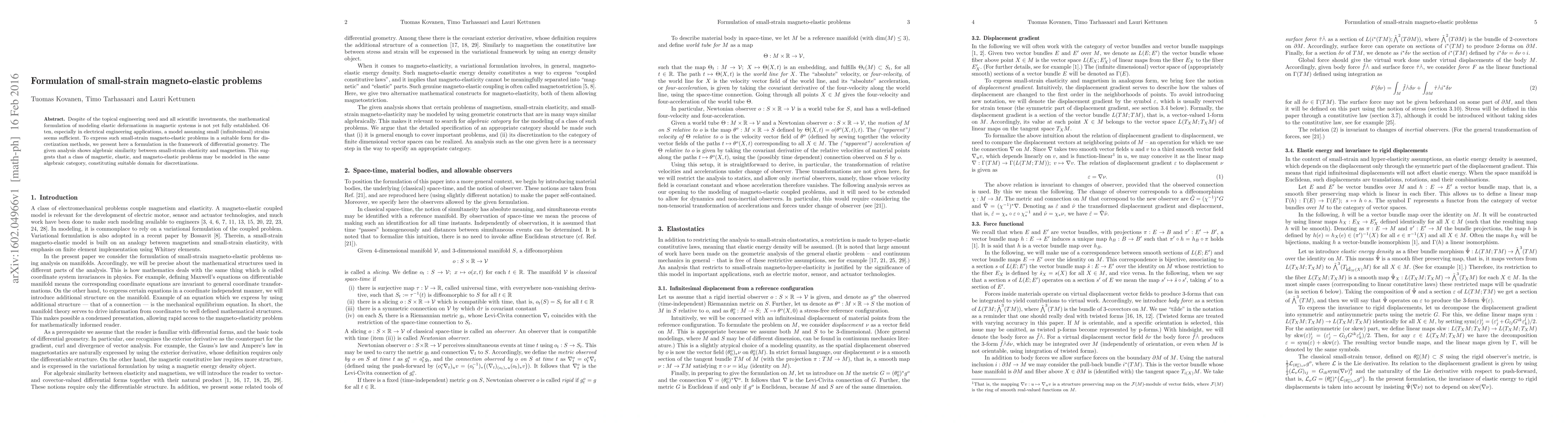 Despite of the topical engineering need and all scientific investments, the mathematical formulation of modeling elastic deformations in magnetic systems is not yet fully established. Often, especially in electrical engineering applications, a model assuming small (infinitesimal) strains seems sufficient. To express such small-strain magneto-elastic problems in a suitable form for discretization methods, we present here a formulation in the framework of differential geometry. The given analysis shows algebraic similarity between small-strain elasticity and magnetism. This suggests that a class of magnetic, elastic, and magneto-elastic problems may be modeled in the same algebraic category, constituting suitable domain for discretizations.