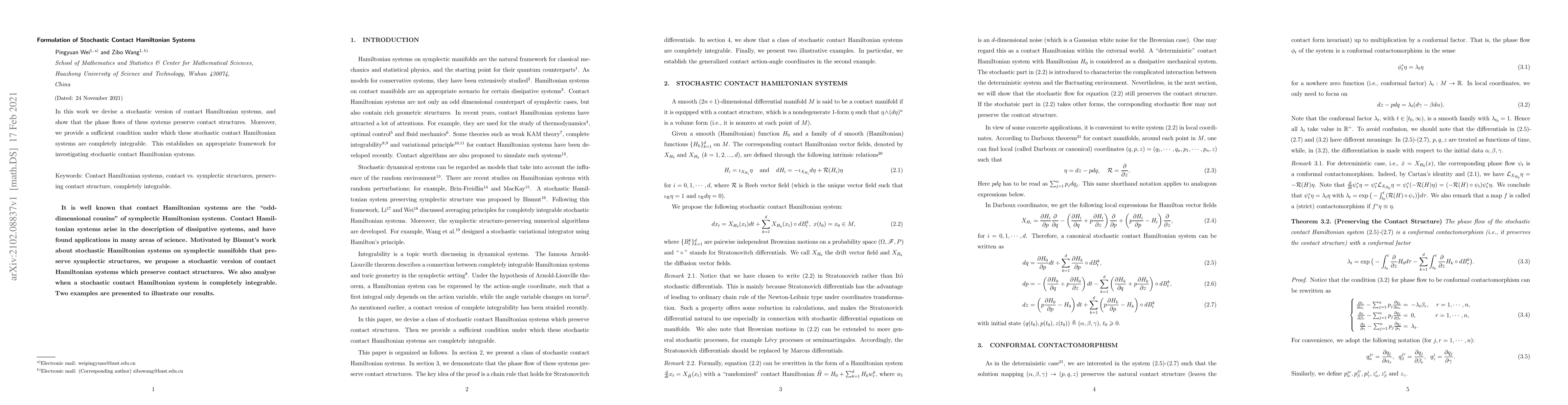 This paper formulates a stochastic version of contact Hamiltonian systems, demonstrating that their phase flows preserve contact structures and providing conditions for complete integrability, thereby establishing a framework for studying these systems.