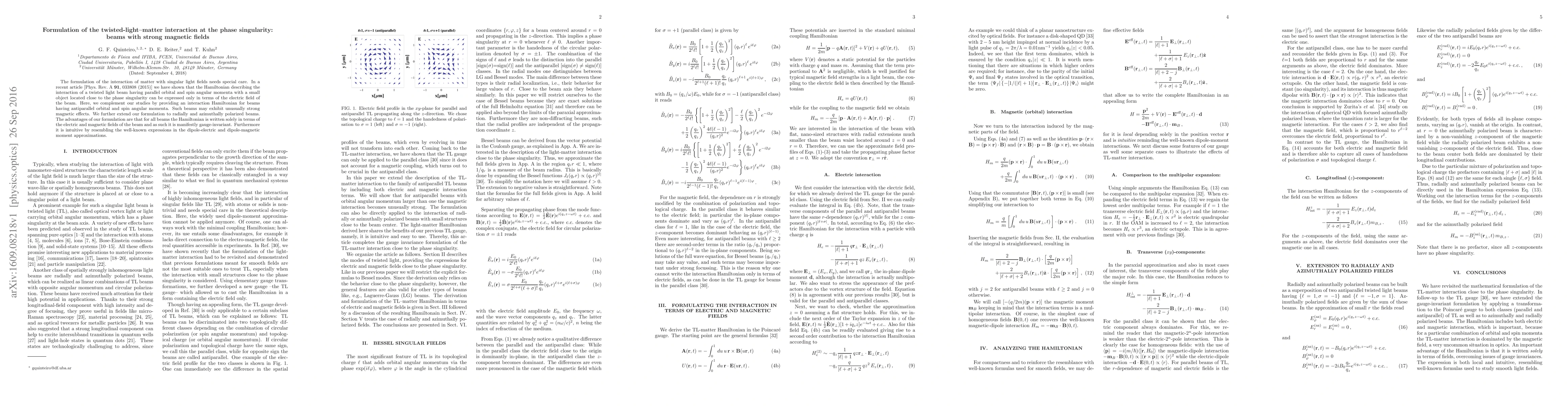 The formulation of the interaction of matter with singular light fields needs special care. In a recent article [Phys.~Rev.~A {\bf 91}, 033808 (2015)] we have shown that the Hamiltonian describing the interaction of a twisted light beam having parallel orbital and spin angular momenta with a small object located close to the phase singularity can be expressed only in terms of the electric field of the beam. Here, we complement our studies by providing an interaction Hamiltonian for beams having antiparallel orbital and spin angular momenta. Such beams may exhibit unusually strong magnetic effects. We further extend our formulation to radially and azimuthally polarized beams. The advantages of our formulation are that for all beams the Hamiltonian is written solely in terms of the electric and magnetic fields of the beam and as such it is manifestly gauge-invariant. Furthermore it is intuitive by resembling the well-known expressions in the dipole-electric and dipole-magnetic moment approximations.