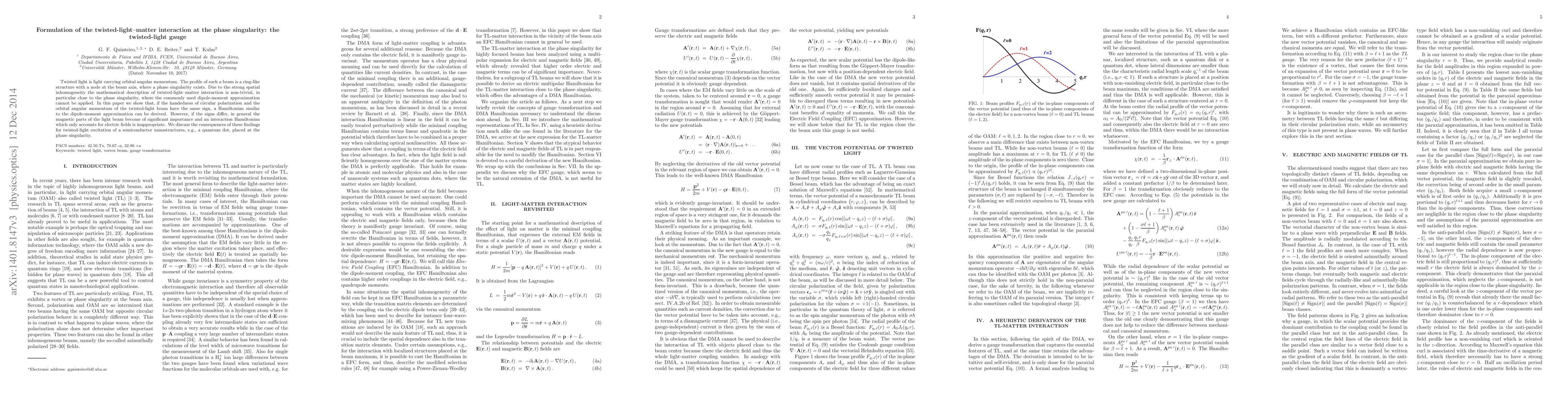 This paper formulates a twisted-light gauge to describe the interaction of twisted light with matter, especially near phase singularities. It finds that a Hamiltonian similar to the dipole-moment approximation holds when the polarization and orbital angular momentum of twisted light have the same sign, but magnetic components become significant when they differ, affecting semiconductor nanostructures like quantum dots.