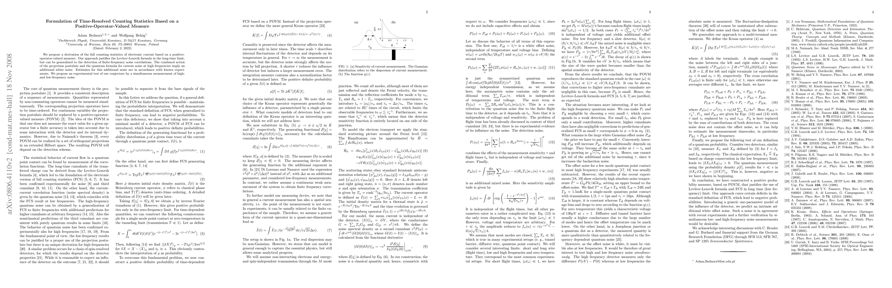 We propose a derivation of the full counting statistics of electronic current based on a positive-operator-valued measure. Our approach justifies the Levitov-Lesovik formula in the long-time limit, but can be generalized to the detection of finite-frequency noise correlations. The combined action of the projection postulate and the quantum formula for current noise at high frequencies imply an additional white noise. Estimates for this additional noise are in accordance with known experiments. We propose an experimental test of our conjecture by a simultaneous measurement of high- and low-frequency noise.