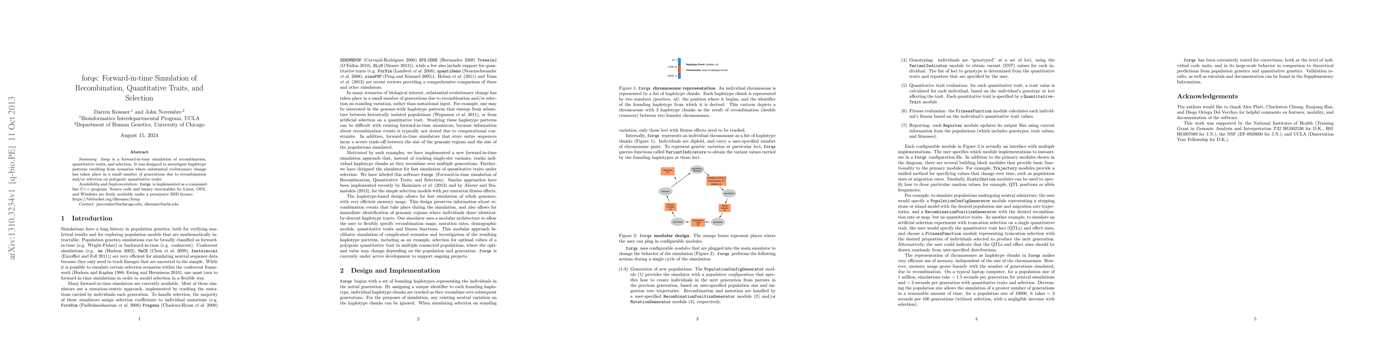 forqs is a forward-in-time simulation of recombination, quantitative traits, and selection. It was designed to investigate haplotype patterns resulting from scenarios where substantial evolutionary change has taken place in a small number of generations due to recombination and/or selection on polygenic quantitative traits. forqs is implemented as a command- line C++ program. Source code and binary executables for Linux, OSX, and Windows are freely available under a permissive BSD license.