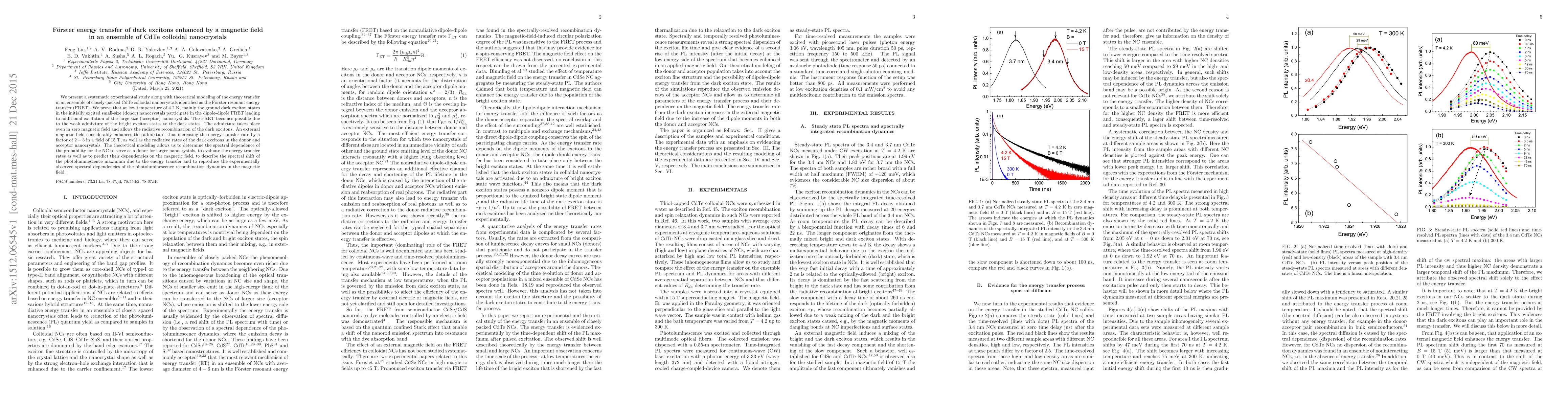 This paper investigates the Förster resonant energy transfer (FRET) in CdTe colloidal nanocrystals, demonstrating that a magnetic field enhances the transfer of dark excitons from small to large nanocrystals by increasing the admixture of bright exciton states. Theoretical modeling supports the experimental findings and predicts the spectral and magnetic field dependencies of the energy transfer rates.