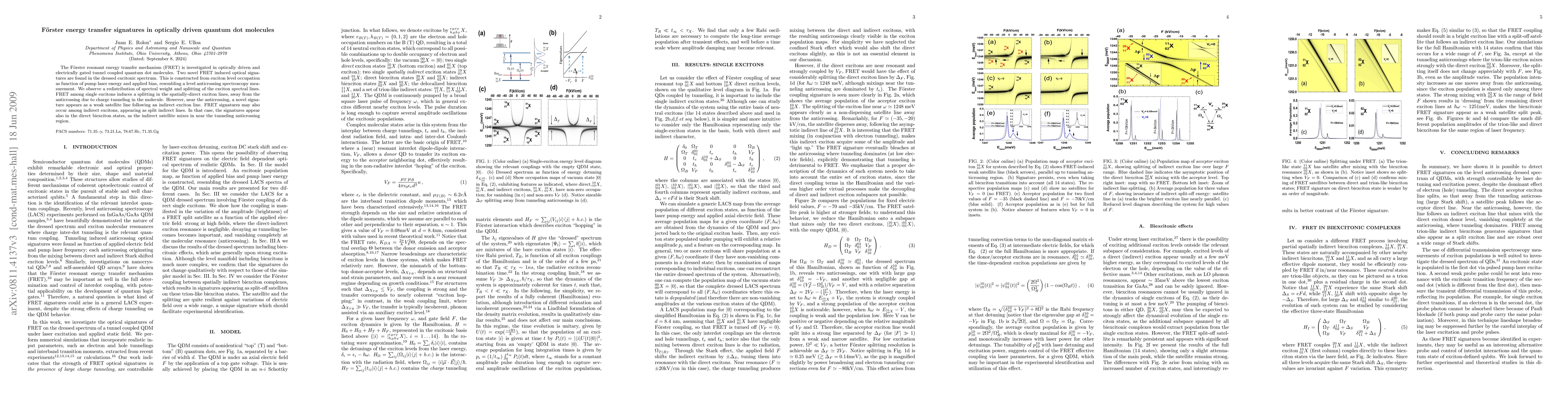 The paper investigates FRET in optically driven quantum dot molecules, revealing novel optical signatures in the dressed excitonic spectrum, including spectral weight redistribution and splitting of exciton lines due to FRET, with additional satellite lines appearing near anticrossing regions. These findings highlight the complex interactions between FRET and charge tunneling in quantum dot systems.
