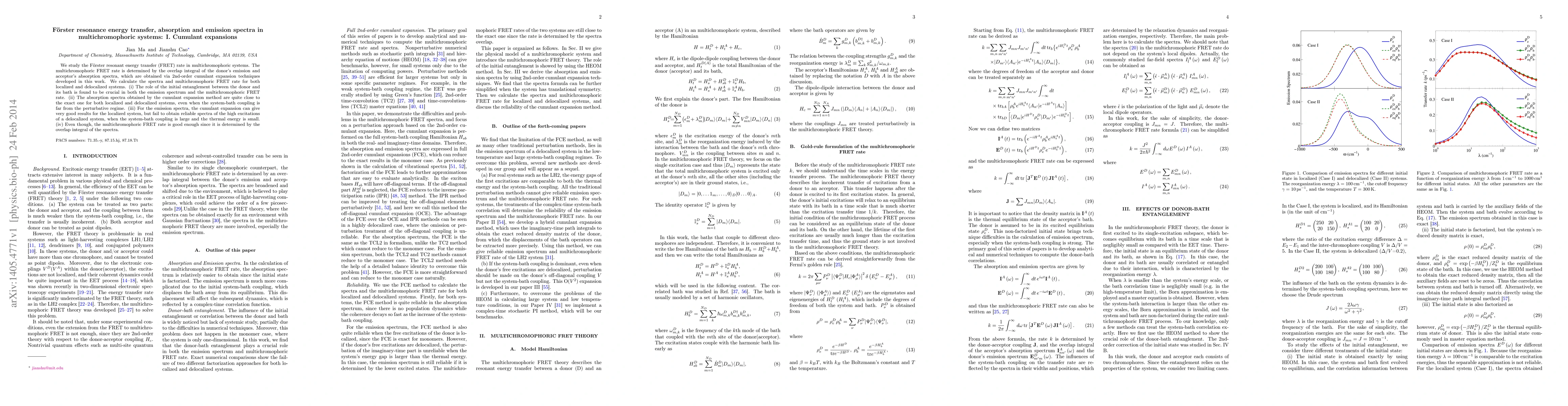 This paper investigates the Förster resonance energy transfer (FRET) rate in multichromophoric systems using 2nd-order cumulant expansion techniques. It finds that initial entanglement between the donor and its environment significantly impacts both emission spectra and the FRET rate, with the cumulant expansion method providing accurate absorption spectra but limited success for high excitations in delocalized systems.
