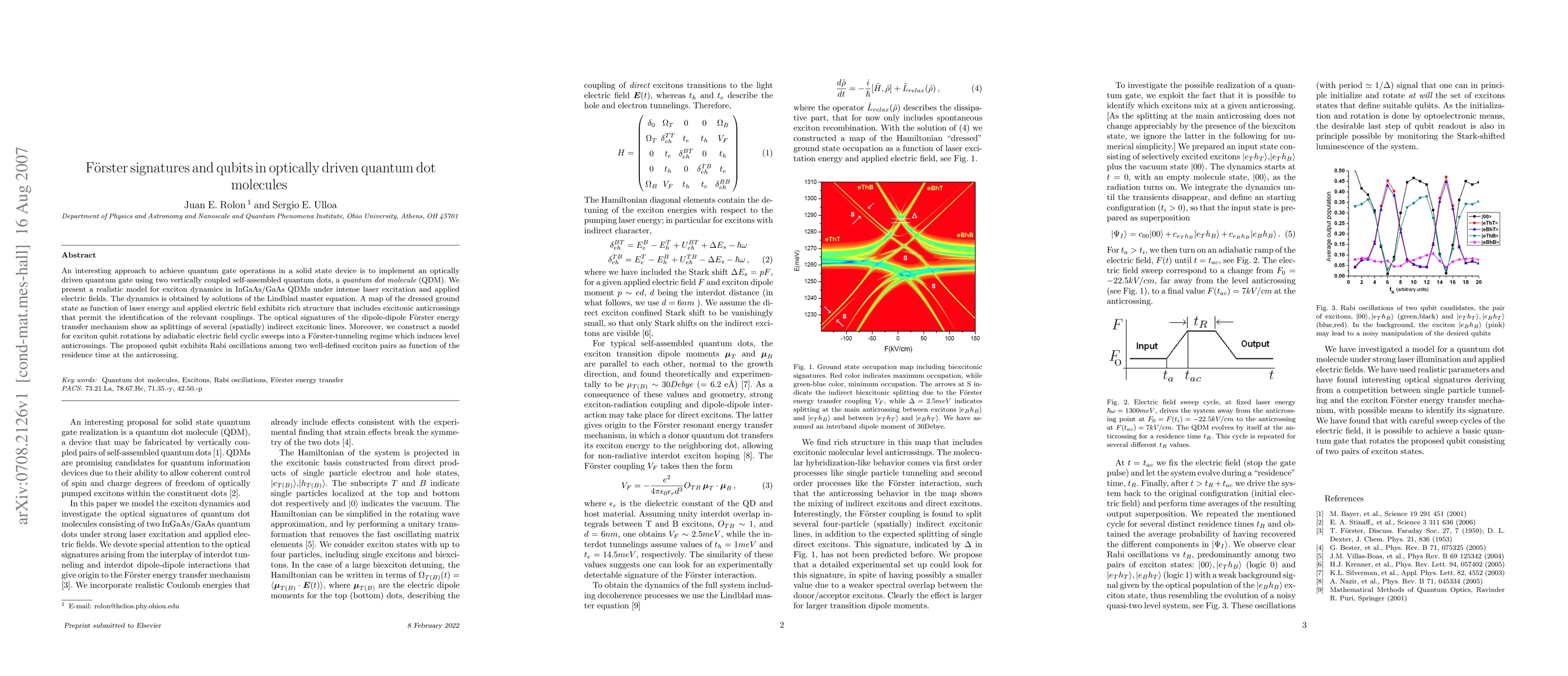 An interesting approach to achieve quantum gate operations in a solid state device is to implement an optically driven quantum gate using two vertically coupled self-assembled quantum dots, a quantum dot molecule (QDM). We present a realistic model for exciton dynamics in InGaAs/GaAs QDMs under intense laser excitation and applied electric fields. The dynamics is obtained by solutions of the Lindblad master equation. A map of the dressed ground state as function of laser energy and applied electric field exhibits rich structure that includes excitonic anticrossings that permit the identification of the relevant couplings. The optical signatures of the dipole-dipole Forster energy transfer mechanism show as splittings of several (spatially) indirect excitonic lines. Moreover, we construct a model for exciton qubit rotations by adiabatic electric field cyclic sweeps into a Forster-tunneling regime which induces level anticrossings. The proposed qubit exhibits Rabi oscillations among two well defined exciton pairs as function of the residence time at the anticrossing.