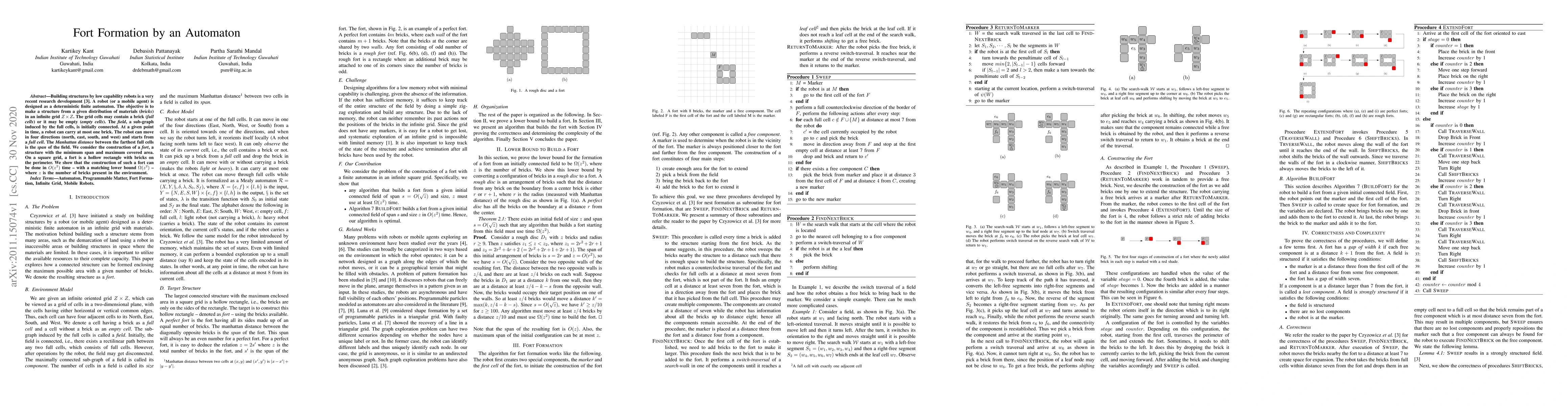Building structures by low capability robots is a very recent research development. A robot (or a mobile agent) is designed as a deterministic finite automaton. The objective is to make a structure from a given distribution of materials (\textit{bricks}) in an infinite grid $Z\times Z$. The grid cells may contain a brick (\textit{full cells}) or it may be empty (\textit{empty cells}). The \textit{field}, a sub-graph induced by the full cells, is initially connected. At a given point in time, a robot can carry at most one brick. The robot can move in four directions (north, east, south, and west) and starts from a \textit{full cell}. The \textit{Manhattan distance} between the farthest full cells is the \textit{span} of the field. We consider the construction of a \textit{fort}, a structure with the minimum span and maximum covered area. On a square grid, a fort is a hollow rectangle with bricks on the perimeter. We show that the construction of such a fort can be done in $O(z^2)$ time -- with a matching lower bound $\Omega(z^2)$ -- where $z$ is the number of bricks present in the environment.