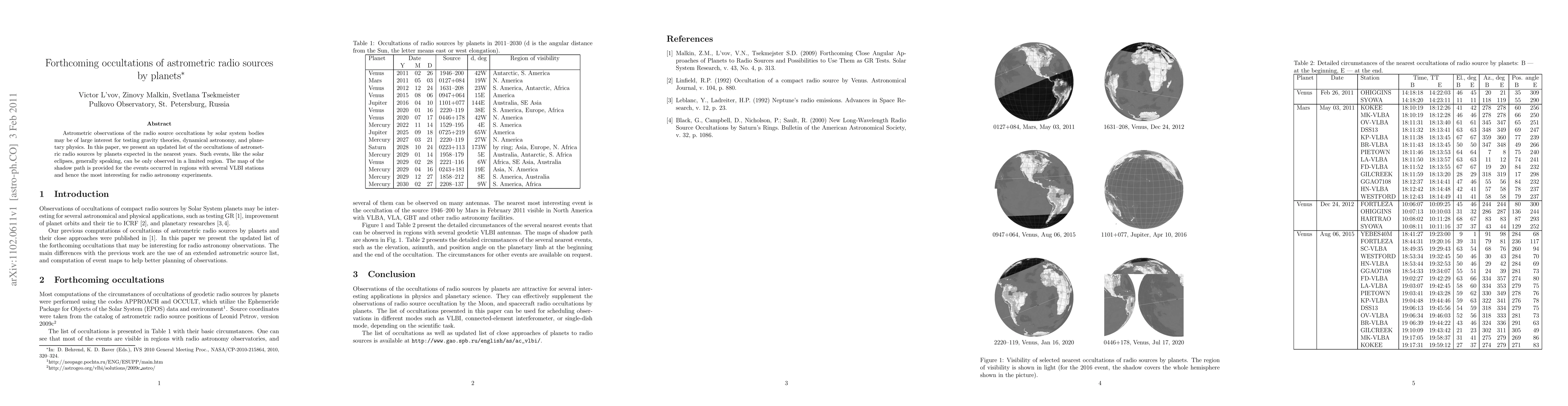 Astrometric observations of the radio source occultations by solar system bodies may be of large interest for testing gravity theories, dynamical astronomy, and planetary physics. In this paper, we present an updated list of the occultations of astrometric radio sources by planets expected in the nearest years. Such events, like the solar eclipses, generally speaking, can be only observed in a limited region. The map of the shadow path is provided for the events occurred in regions with several VLBI stations and hence the most interesting for radio astronomy experiments.