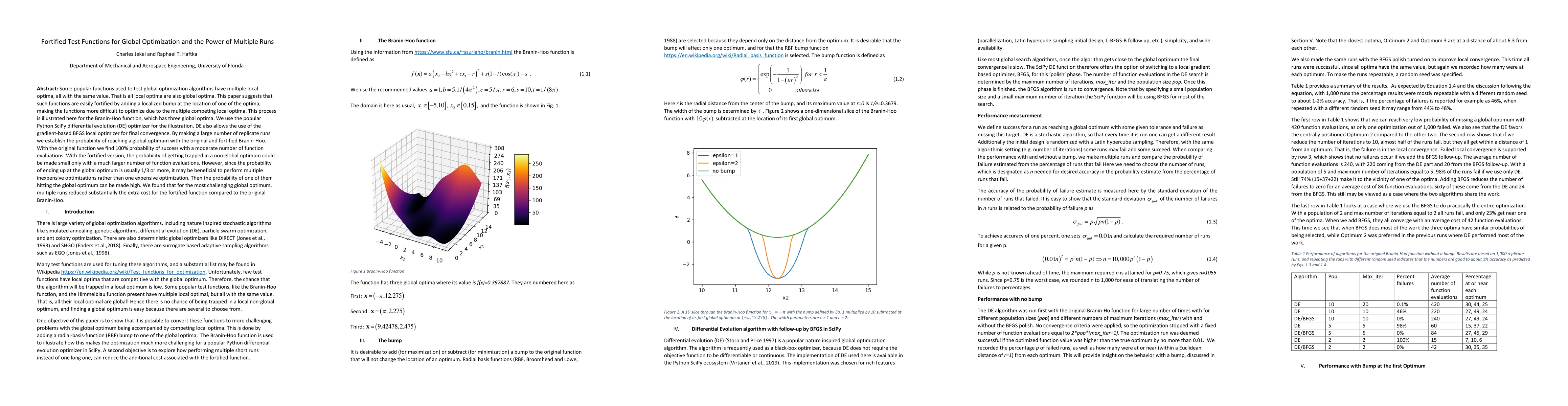 This paper proposes fortifying test functions for global optimization by adding localized bumps to create multiple competing local optima, using the Branin-Hoo function as an example. It demonstrates that multiple runs of optimization algorithms can significantly reduce the extra cost of finding the global optimum for fortified functions compared to a single expensive run.