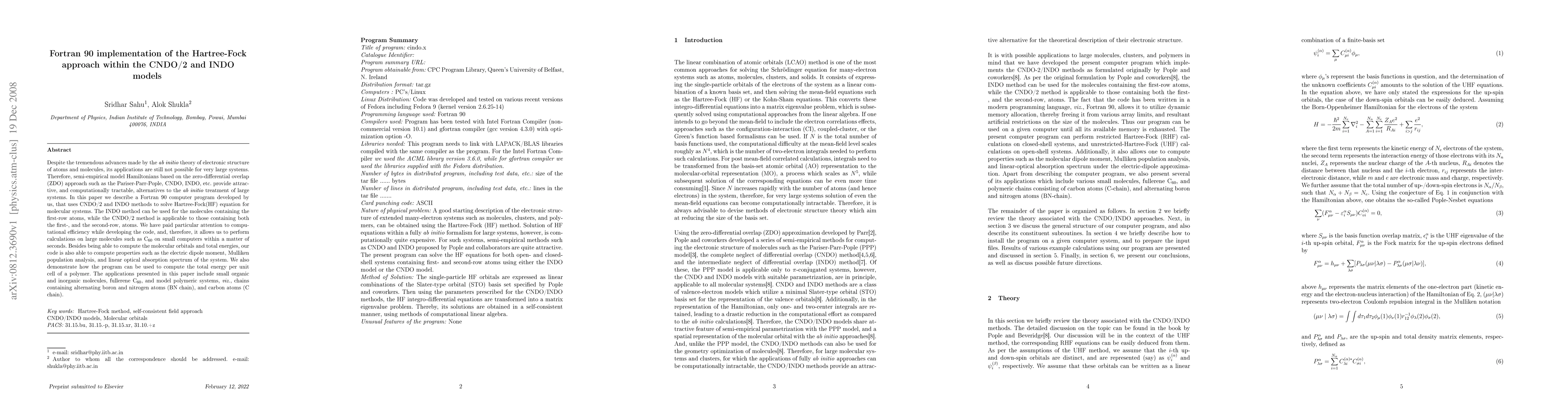 This paper presents a Fortran 90 implementation of the Hartree-Fock approach using CNDO/2 and INDO models, enabling efficient calculations on large molecules like C60 on small computers.