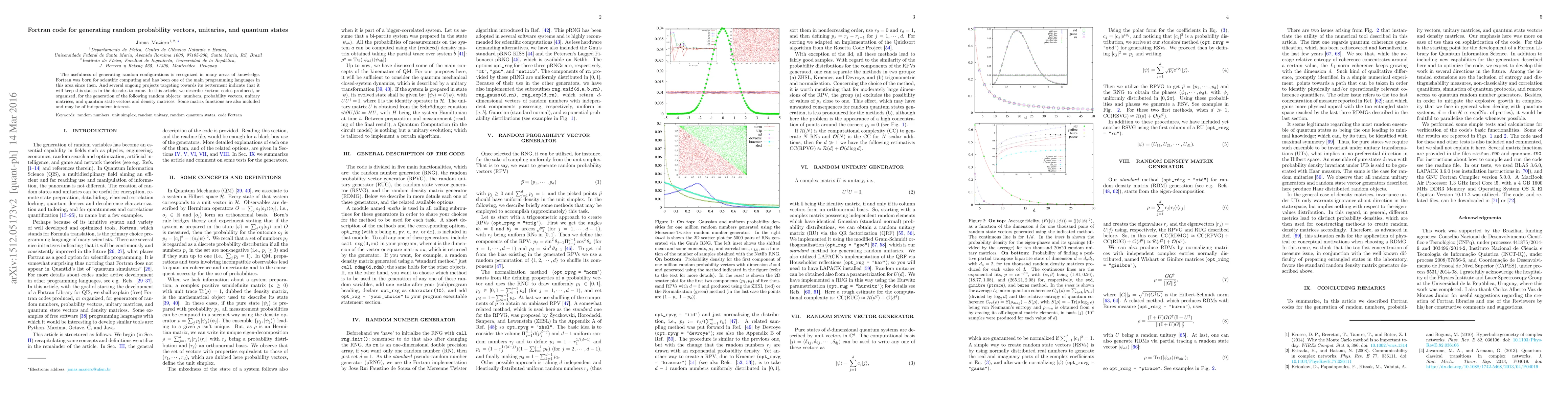 The usefulness of generating random configurations is recognized in many areas of knowledge. Fortran was born for scientific computing and has been one of the main programming languages in this area since then. And several ongoing projects targeting towards its betterment indicate that it will keep this status in the decades to come. In this article, we describe Fortran codes produced, or organized, for the generation of the following random objects: numbers, probability vectors, unitary matrices, and quantum state vectors and density matrices. Some matrix functions are also included and may be of independent interest.
