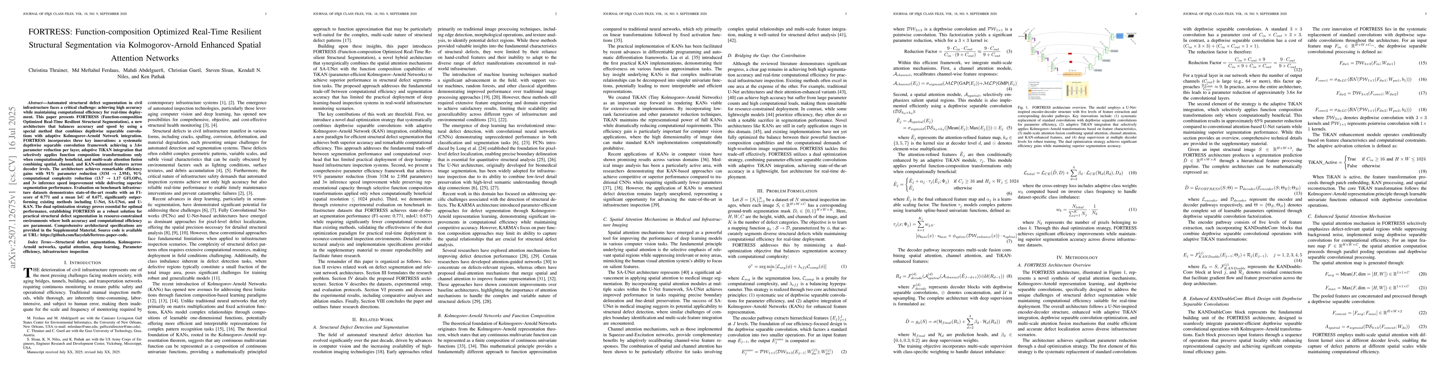 Automated structural defect segmentation in civil infrastructure faces a critical challenge: achieving high accuracy while maintaining computational efficiency for real-time deployment. This paper presents FORTRESS (Function-composition Optimized Real-Time Resilient Structural Segmentation), a new architecture that balances accuracy and speed by using a special method that combines depthwise separable convolutions with adaptive Kolmogorov-Arnold Network integration. FORTRESS incorporates three key innovations: a systematic depthwise separable convolution framework achieving a 3.6x parameter reduction per layer, adaptive TiKAN integration that selectively applies function composition transformations only when computationally beneficial, and multi-scale attention fusion combining spatial, channel, and KAN-enhanced features across decoder levels. The architecture achieves remarkable efficiency gains with 91% parameter reduction (31M to 2.9M), 91% computational complexity reduction (13.7 to 1.17 GFLOPs), and 3x inference speed improvement while delivering superior segmentation performance. Evaluation on benchmark infrastructure datasets demonstrates state-of-the-art results with an F1- score of 0.771 and a mean IoU of 0.677, significantly outperforming existing methods including U-Net, SA-UNet, and U- KAN. The dual optimization strategy proves essential for optimal performance, establishing FORTRESS as a robust solution for practical structural defect segmentation in resource-constrained environments where both accuracy and computational efficiency are paramount. Comprehensive architectural specifications are provided in the Supplemental Material. Source code is available at URL: https://github.com/faeyelab/fortress-paper-code.