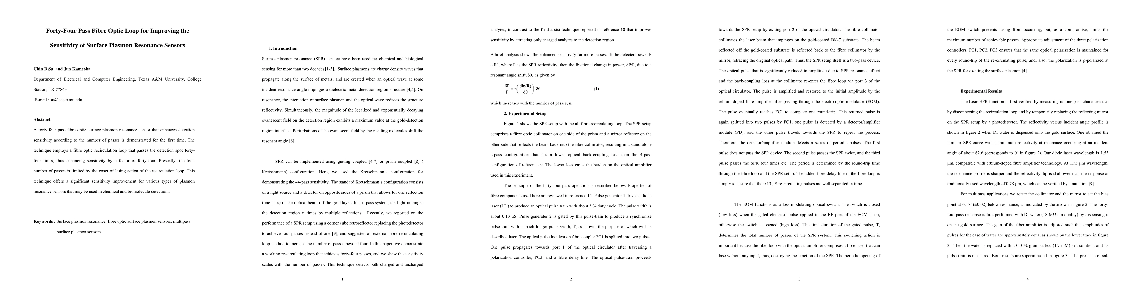 This paper presents a forty-four pass fibre optic loop that enhances surface plasmon resonance sensor sensitivity by circulating light forty-four times, significantly improving detection sensitivity. The technique faces limitations due to lasing onset but shows promise for chemical and biomolecule detection applications.