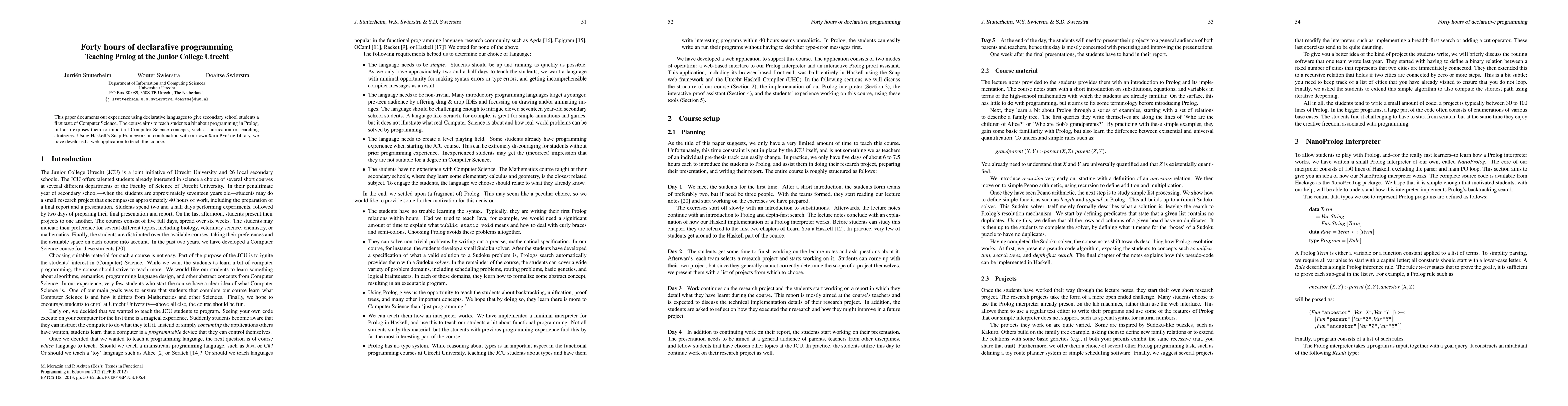 This paper details a course using Prolog to introduce secondary school students to Computer Science, focusing on concepts like unification and searching strategies, facilitated through a web application combining Haskell's Snap Framework and the NanoProlog library.