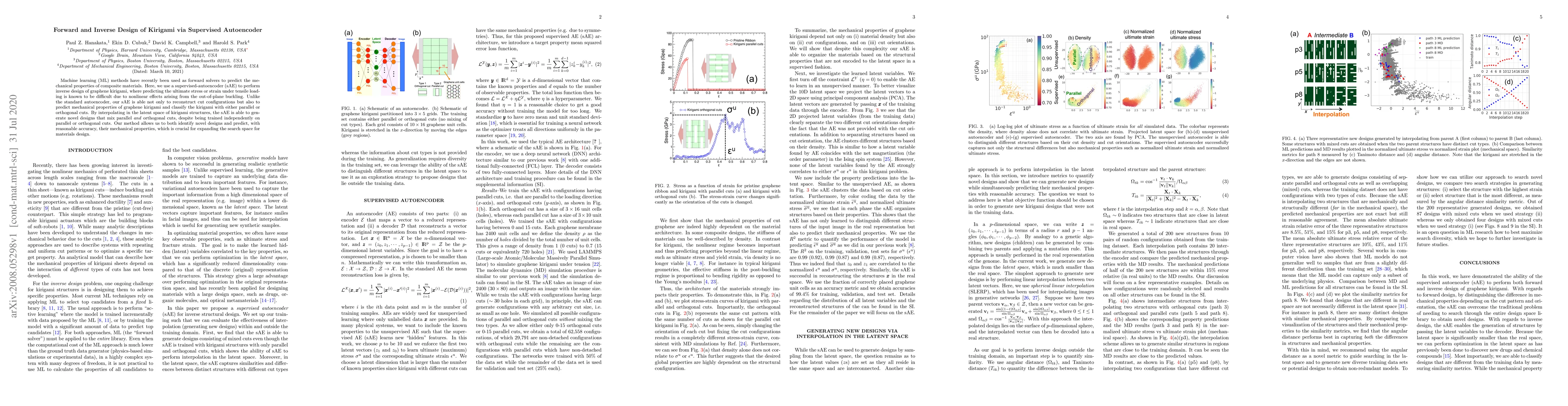This paper uses a supervised-autoencoder to predict and design graphene kirigami structures, enabling the generation of novel designs with mixed cut configurations. The method accurately predicts mechanical properties and classifies kirigami with parallel or orthogonal cuts, expanding the potential for material design.
