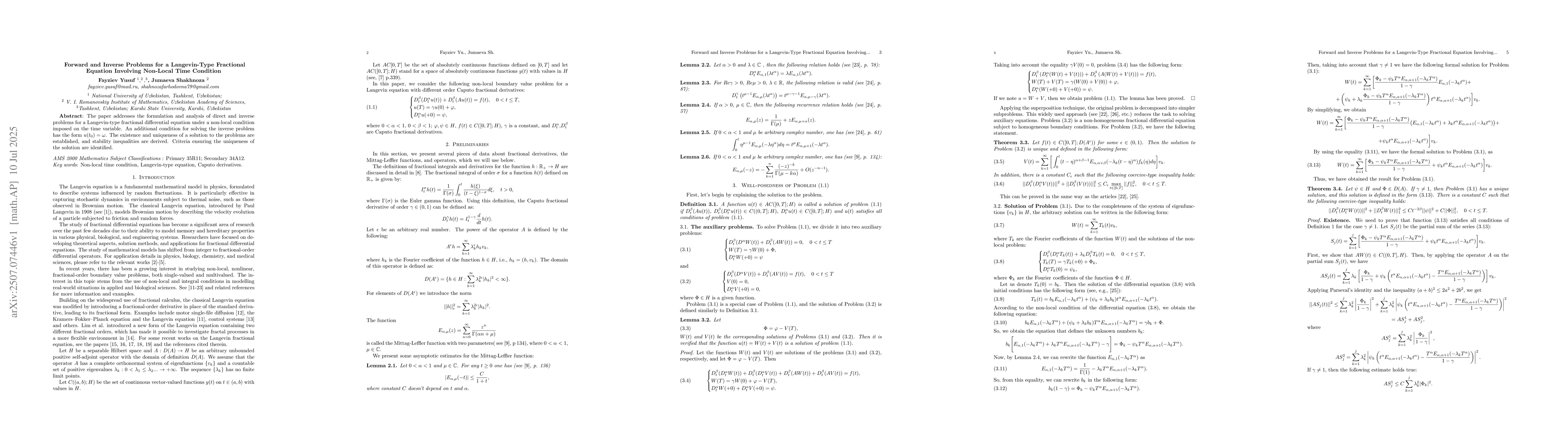 The paper addresses the formulation and analysis of direct and inverse problems for a Langevin-type fractional differential equation under a non-local condition imposed on the time variable. An additional condition for solving the inverse problem has the form $u(t_0)=\omega$. The existence and uniqueness of a solution to the problems are established, and stability inequalities are derived. Criteria ensuring the uniqueness of the solution are identified.