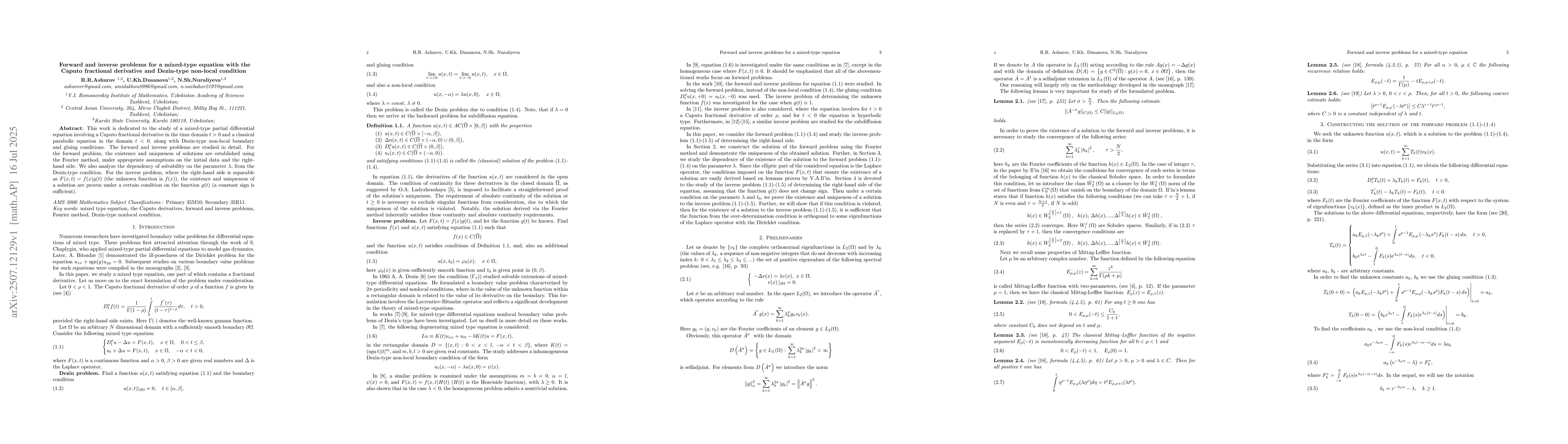 This work is dedicated to the study of a mixed-type partial differential equation involving a Caputo fractional derivative in the time domain $t > 0$ and a classical parabolic equation in the domain $t < 0$, along with Dezin-type non-local boundary and gluing conditions. The forward and inverse problems are studied in detail. For the forward problem, the existence and uniqueness of solutions are established using the Fourier method, under appropriate assumptions on the initial data and the right-hand side. We also analyze the dependency of solvability on the parameter $\lambda$, from the Dezin-type condition. For the inverse problem, where the right-hand side is separable as $F(x,t) = f(x)g(t)$ (the unknown function is $f(x)$), the existence and uniqueness of a solution are proven under a certain condition on the function $g(t)$ (a constant sign is sufficient).