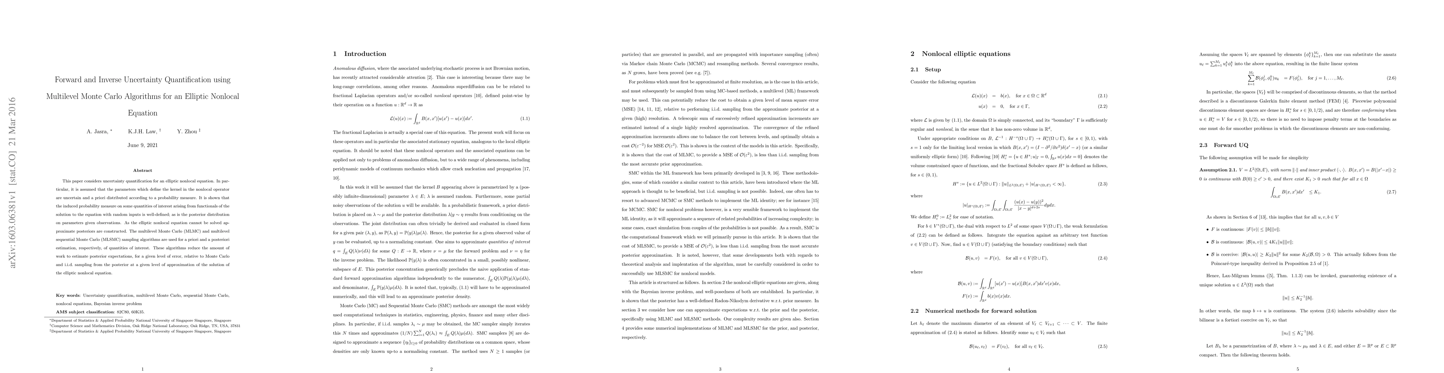 This paper considers uncertainty quantification for an elliptic nonlocal equation. In particular, it is assumed that the parameters which define the kernel in the nonlocal operator are uncertain and a priori distributed according to a probability measure. It is shown that the induced probability measure on some quantities of interest arising from functionals of the solution to the equation with random inputs is well-defined; as is the posterior distribution on parameters given observations. As the elliptic nonlocal equation cannot be solved approximate posteriors are constructed. The multilevel Monte Carlo (MLMC) and multilevel sequential Monte Carlo (MLSMC) sampling algorithms are used for a priori and a posteriori estimation, respectively, of quantities of interest. These algorithms reduce the amount of work to estimate posterior expectations, for a given level of error, relative to Monte Carlo and i.i.d. sampling from the posterior at a given level of approximation of the solution of the elliptic nonlocal equation.