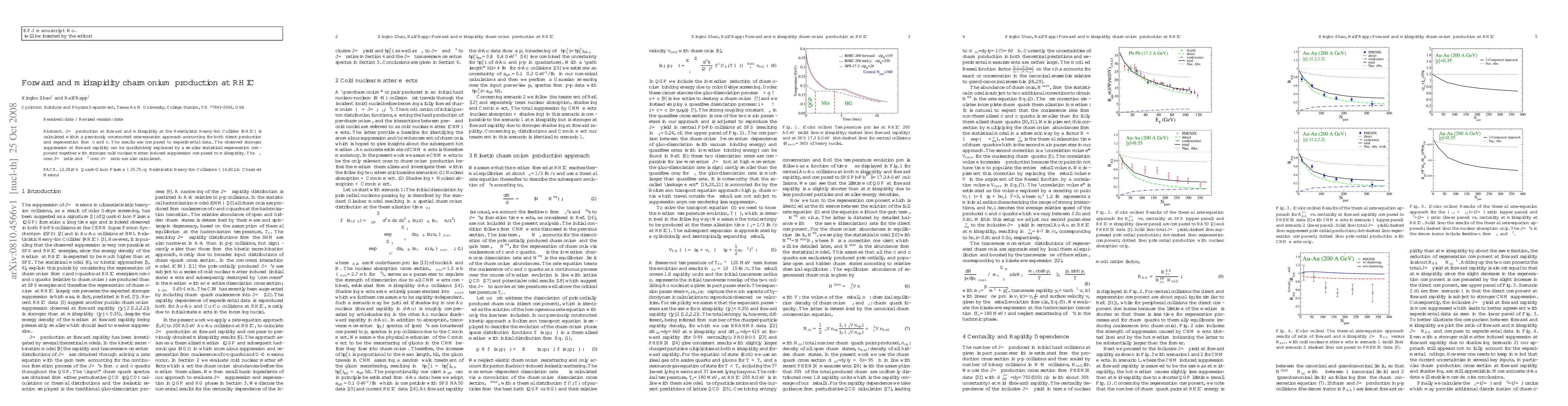This paper calculates $J/\psi$ production at forward and midrapidity in RHIC collisions using a rate-equation model, showing stronger suppression at forward rapidity due to reduced regeneration and enhanced cold nuclear matter effects. The study also compares $\chi_c$ and $\psi'$ over $J/\psi$ ratios.