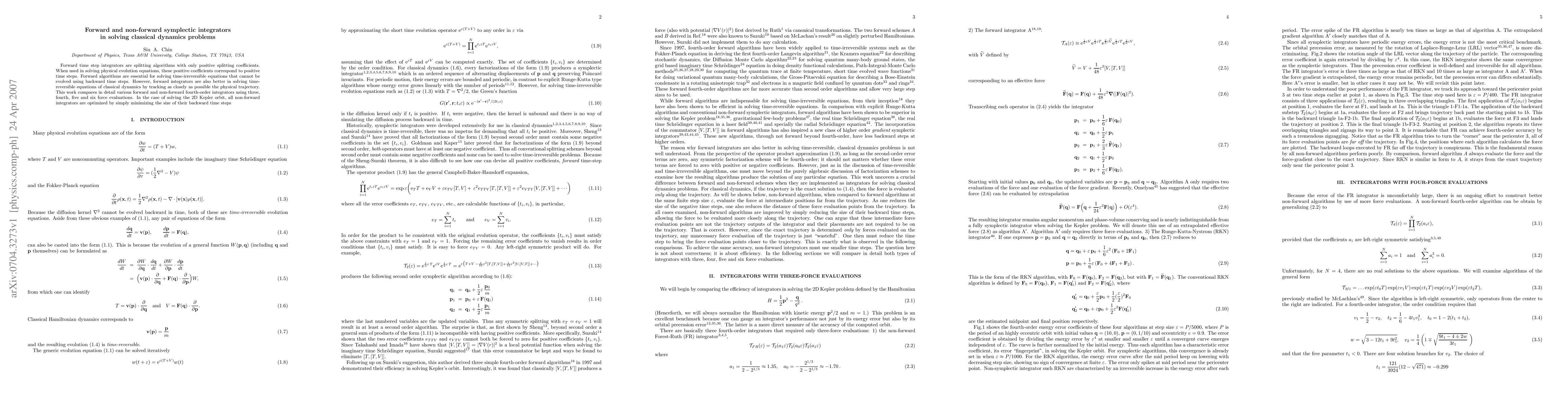This study compares various forward and non-forward fourth-order integrators for solving classical dynamics problems using three, four, five, and six force evaluations.