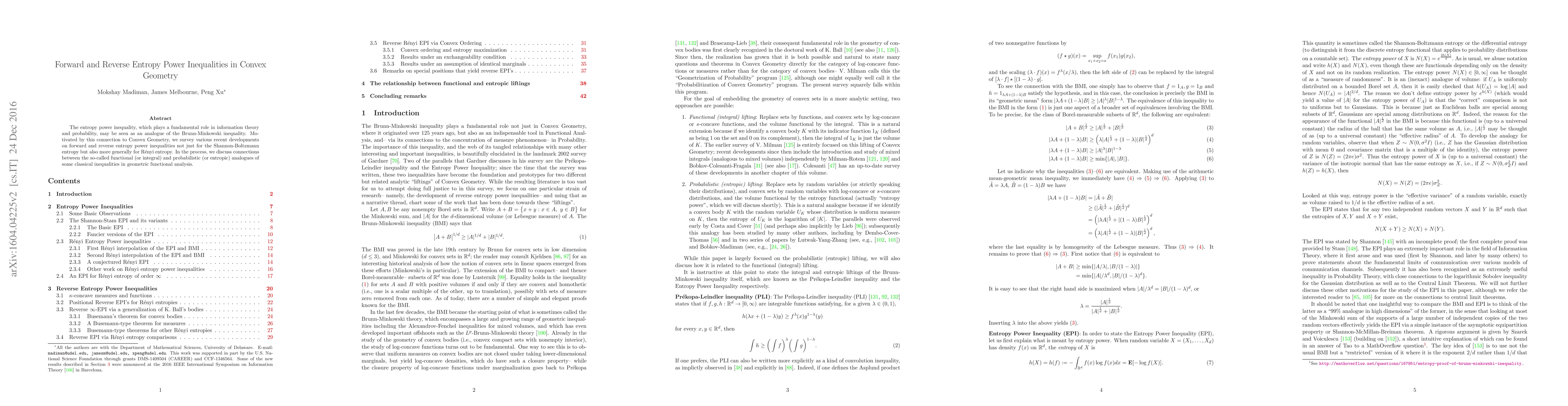 The entropy power inequality, which plays a fundamental role in information theory and probability, may be seen as an analogue of the Brunn-Minkowski inequality. Motivated by this connection to Convex Geometry, we survey various recent developments on forward and reverse entropy power inequalities not just for the Shannon-Boltzmann entropy but also more generally for R\'enyi entropy. In the process, we discuss connections between the so-called functional (or integral) and probabilistic (or entropic) analogues of some classical inequalities in geometric functional analysis