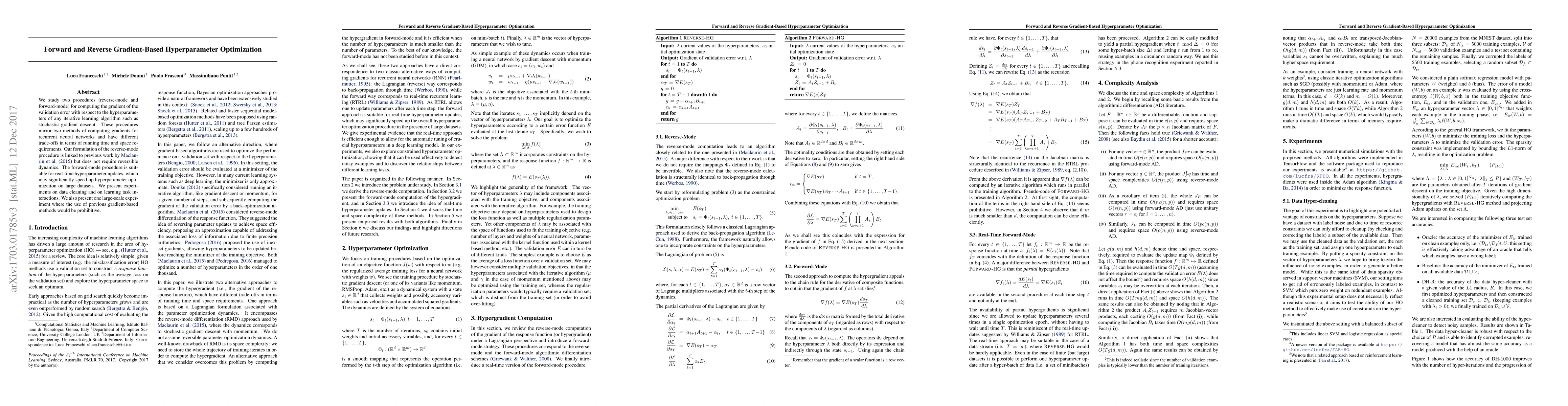 This paper compares forward-mode and reverse-mode gradient-based methods for hyperparameter optimization in iterative learning algorithms, focusing on their trade-offs in time and space. The forward-mode method is particularly suited for real-time updates, potentially speeding up optimization on large datasets.