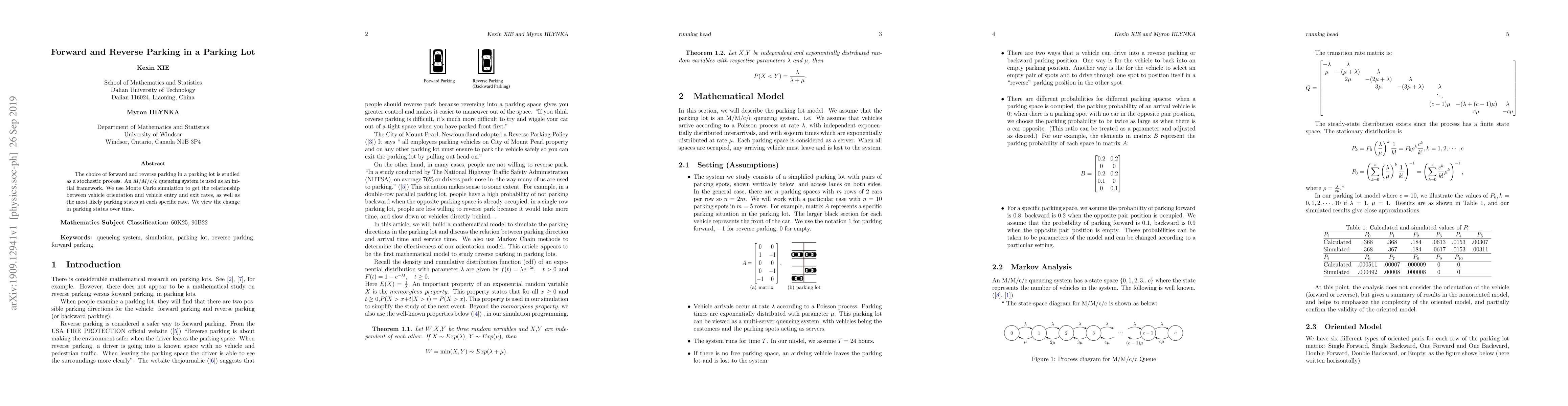 This research study models forward and reverse parking in a lot as a stochastic process using an M/M/c/c queueing system. It explores the relationship between vehicle orientation and entry/exit rates, and identifies key parking states over time.