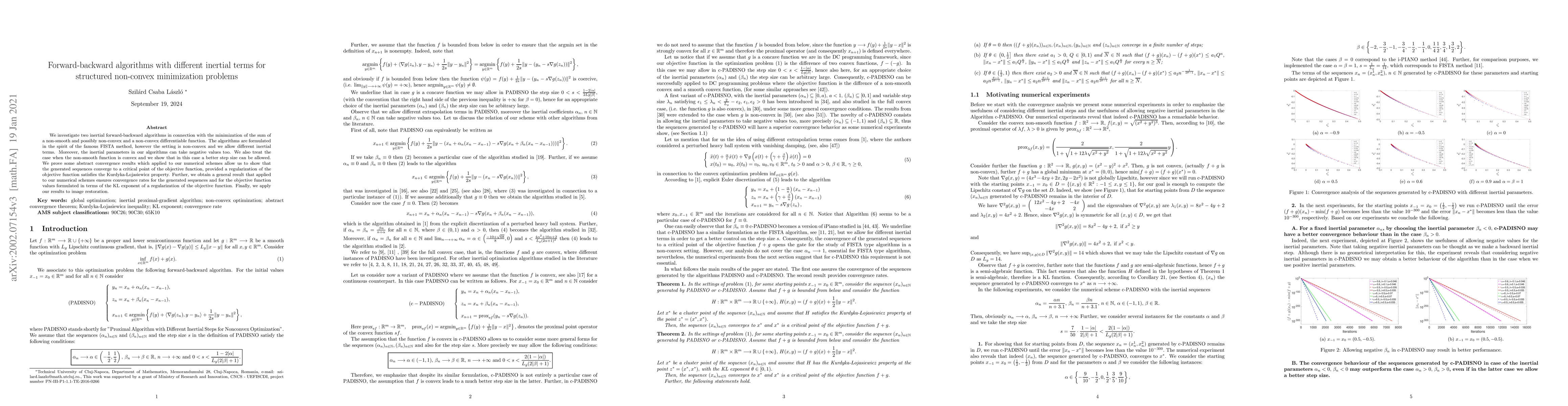 This paper proposes two inertial forward-backward algorithms for minimizing non-convex functions, extending the FISTA method with non-negative inertial terms and negative values. It proves convergence and convergence rates under the Kurdyka-Lojasiewicz property and applies the results to image restoration.