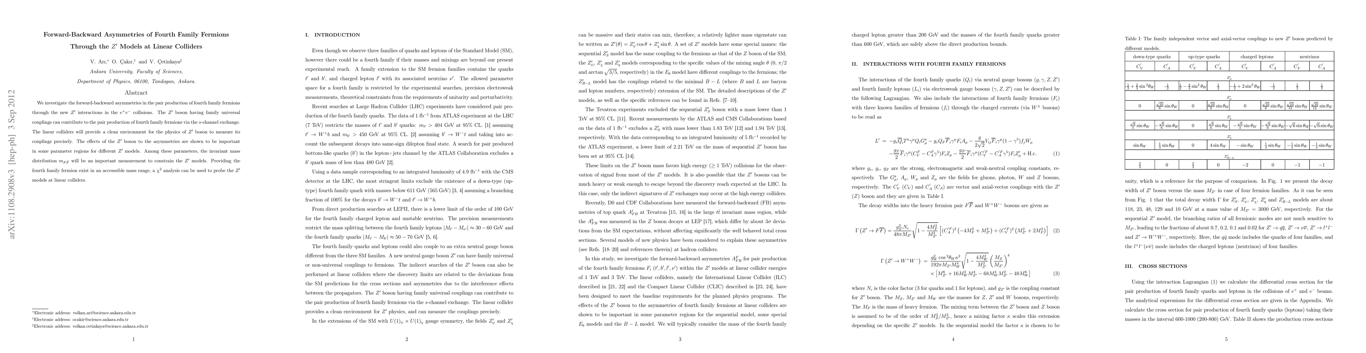 We investigate the forward-backward asymmetries in the pair production of fourth family fermions through the new Z' interactions in the e+e- collisions. The Z' boson having family universal couplings can contribute to the pair production of fourth family fermions via the s-channel exchange. The linear colliders will provide a clean environment for the physics of Z' boson to measure its couplings precisely. The effects of the Z' boson to the asymmetries are shown to be important in some parameter regions for different Z' models. Among these parameters, the invariant mass distribution m_FFbar will be an important measurement to constrain the Z' models. Providing the fourth family fermion exist in an accesssible mass range, a chi^2 analysis can also be used to probe the Z' models at linear collider energies.