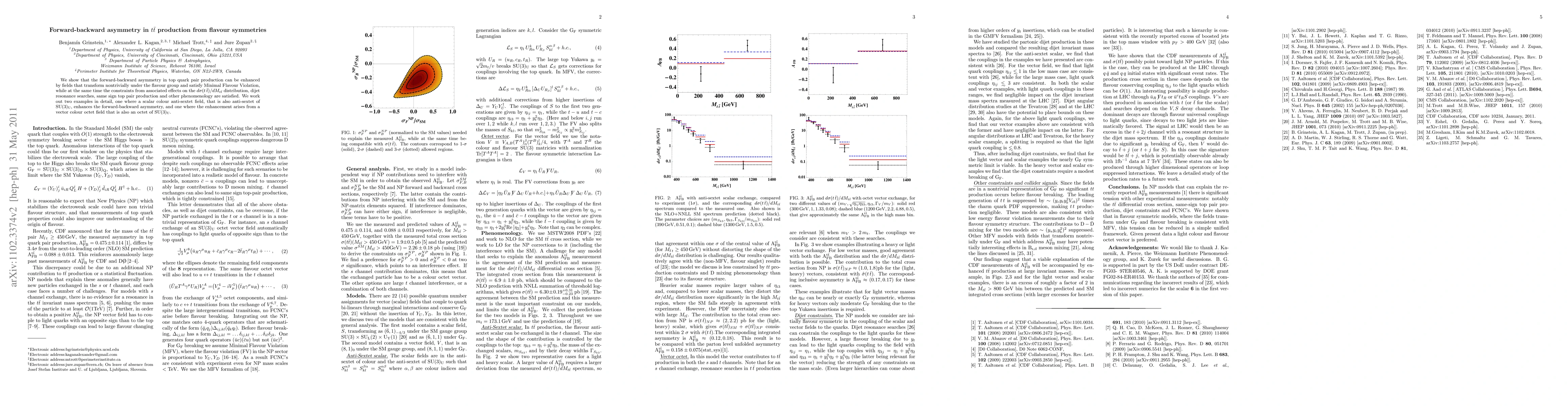 This paper demonstrates that forward-backward asymmetry in top quark pair production can be significantly enhanced by fields respecting Minimal Flavour Violation, specifically scalar and vector fields transforming nontrivially under the flavour group. Both examples satisfy additional phenomenological constraints.