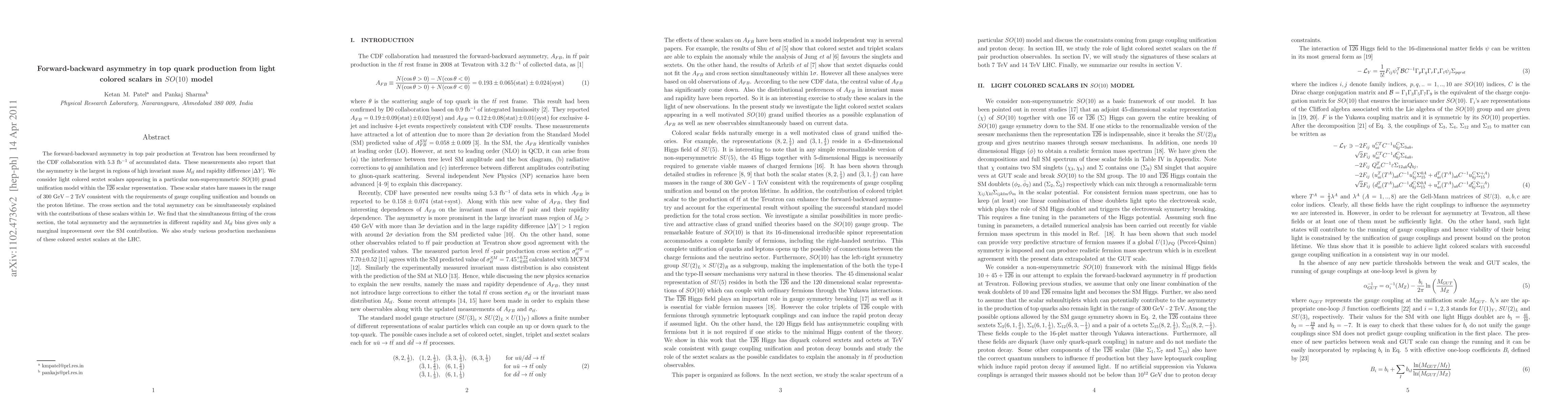 The forward-backward asymmetry in top pair production at Tevatron has been reconfirmed by the CDF collaboration with 5.3 fb^{-1} of accumulated data. These measurements also report that the asymmetry is the largest in regions of high invariant mass M_{t\bar{t}} and rapidity difference |\Delta Y|. We consider light colored sextet scalars appearing in a particular non-supersymmetric \10 grand unification model within the \bar{126} scalar representation. These scalar states have masses in the range of 300 \text{GeV}-2 \text{TeV} consistent with the requirements of gauge coupling unification and bounds on the proton lifetime. The cross section and the total asymmetry can be simultaneously explained with the contributions of these scalars within 1$\sigma$. We find that the simultaneous fitting of the cross section, the total asymmetry and the asymmetries in different rapidity and M_{t\bar{t}} bins gives only a marginal improvement over the SM contribution. We also study various production mechanisms of these colored sextet scalars at the LHC.