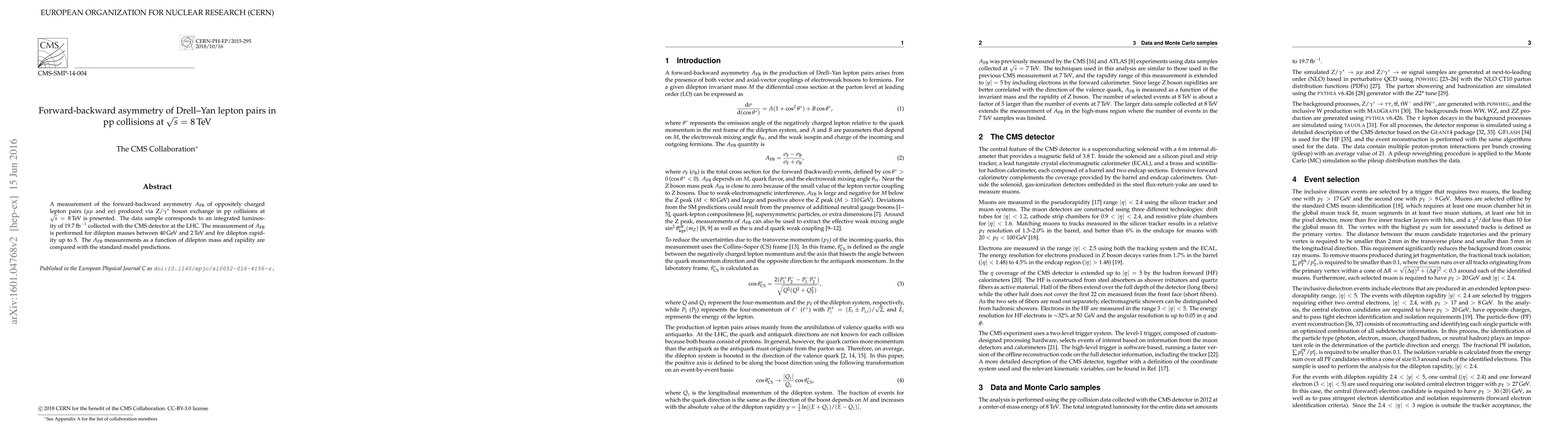 This paper presents a measurement of the forward-backward asymmetry of oppositely charged lepton pairs produced via Z/gamma* boson exchange in proton-proton collisions at 8 TeV, using data from the CMS detector at the LHC. The results are compared with standard model predictions for dilepton masses between 40 GeV and 2 TeV.