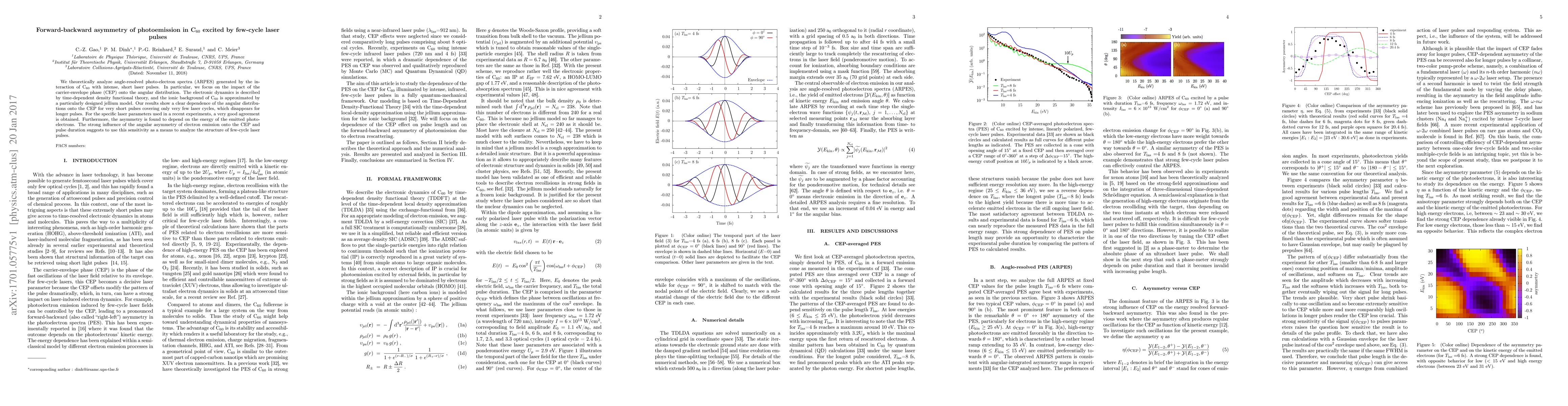 We theoretically analyze angle-resolved photo-electron spectra (ARPES) generated by the interaction of C$_{60}$ with intense, short laser pulses. In particular, we focus on the impact of the carrier-envelope phase (CEP) onto the angular distribution. The electronic dynamics is described by time-dependent density functional theory, and the ionic background of $\csixty$ is approximated by a particularly designed jellium model. Our results show a clear dependence of the angular distributions onto the CEP for very short pulses covering only very few laser cycles, which disappears for longer pulses. For the specific laser parameters used in a recent experiments, a very good agreement is obtained. Furthermore, the asymmetry is found to depend on the energy of the emitted photoelectrons. The strong influence of the angular asymmetry of electron emission onto the CEP and pulse duration suggests to use this sensitivity as a means to analyze the structure of few-cycle laser pulses.