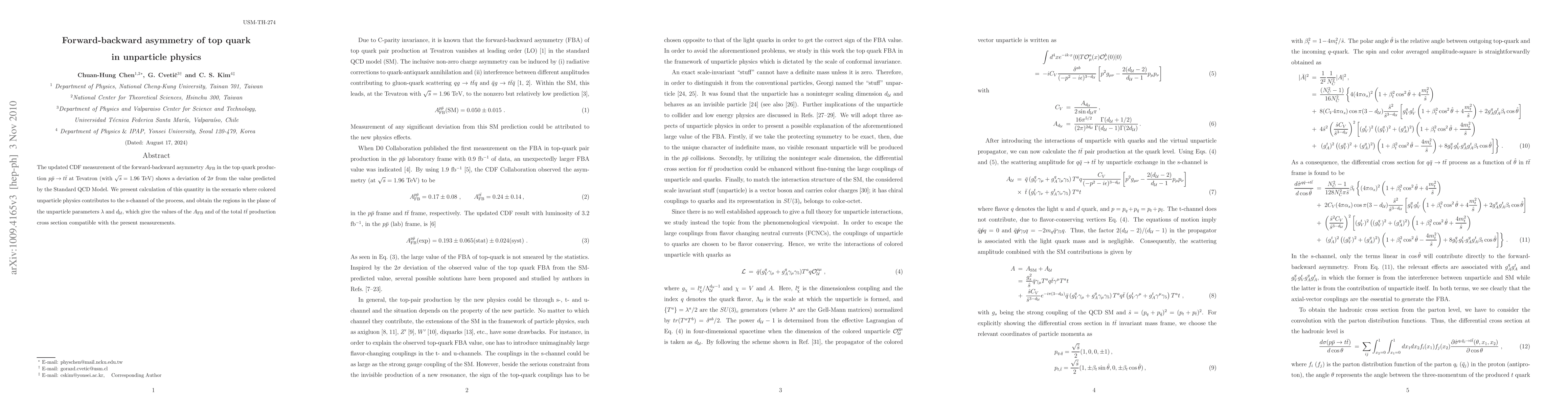 This paper investigates the forward-backward asymmetry in top quark production at the Tevatron, finding a 2*sigma deviation from Standard QCD predictions. It explores contributions from colored unparticle physics in the s-channel, identifying parameter regions that align with experimental measurements.