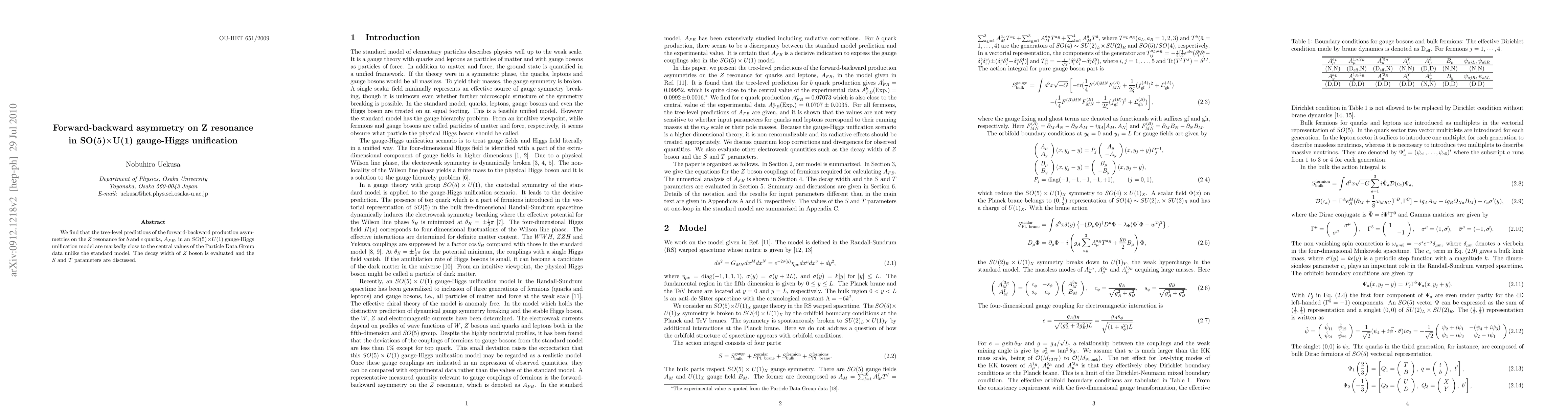 This paper investigates forward-backward asymmetry on Z resonance in an SO(5) x U(1) gauge-Higgs unification model, finding that its predictions closely match the Particle Data Group data, unlike the standard model. The study also evaluates the Z boson decay width and discusses the S and T parameters.