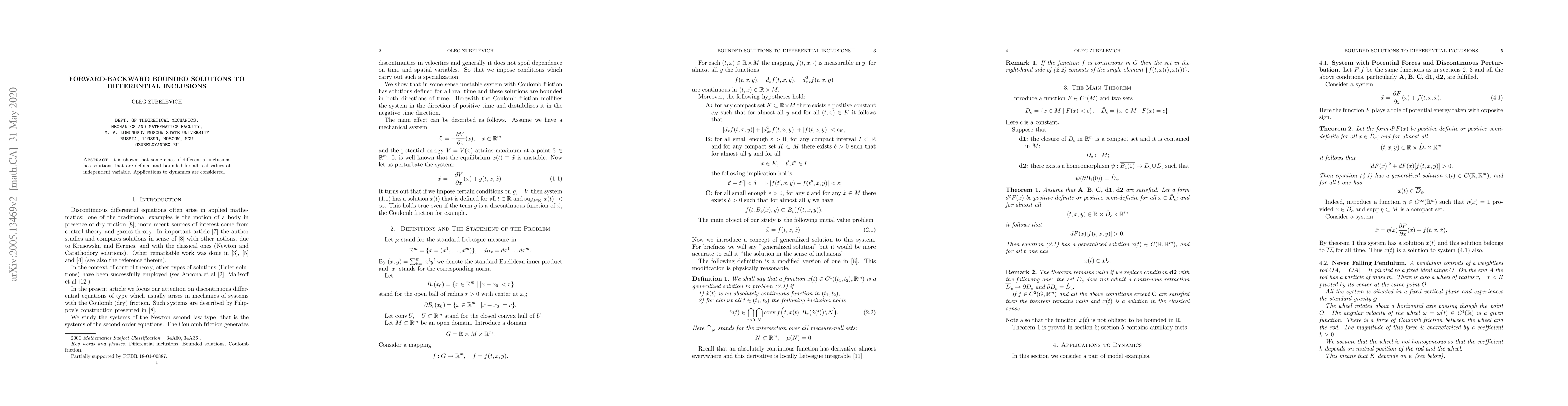 It is shown that some class of differential inclusions has solutions that are defined and bounded for all real values of independent variable. Applications to dynamics are considered.