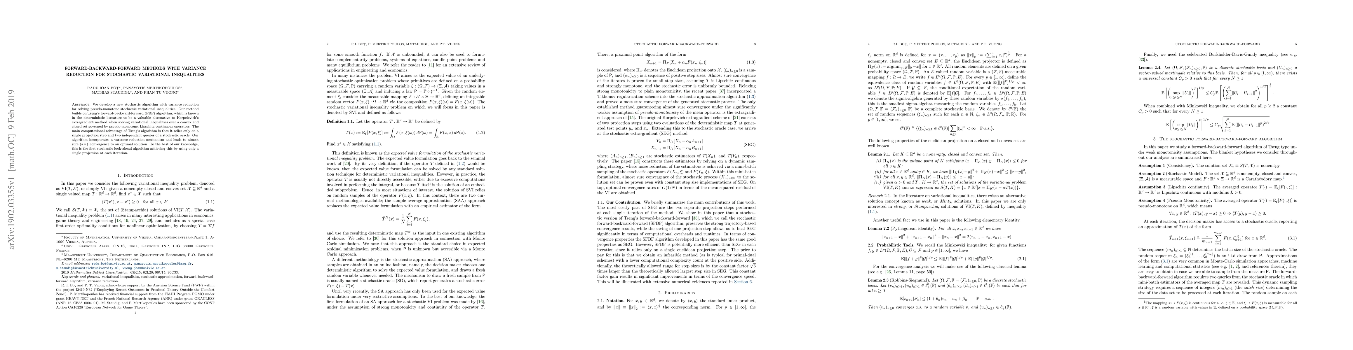 We develop a new stochastic algorithm with variance reduction for solving pseudo-monotone stochastic variational inequalities. Our method builds on Tseng's forward-backward-forward (FBF) algorithm, which is known in the deterministic literature to be a valuable alternative to Korpelevich's extragradient method when solving variational inequalities over a convex and closed set governed by pseudo-monotone, Lipschitz continuous operators. The main computational advantage of Tseng's algorithm is that it relies only on a single projection step and two independent queries of a stochastic oracle. Our algorithm incorporates a variance reduction mechanism and leads to almost sure (a.s.) convergence to an optimal solution. To the best of our knowledge, this is the first stochastic look-ahead algorithm achieving this by using only a single projection at each iteration..