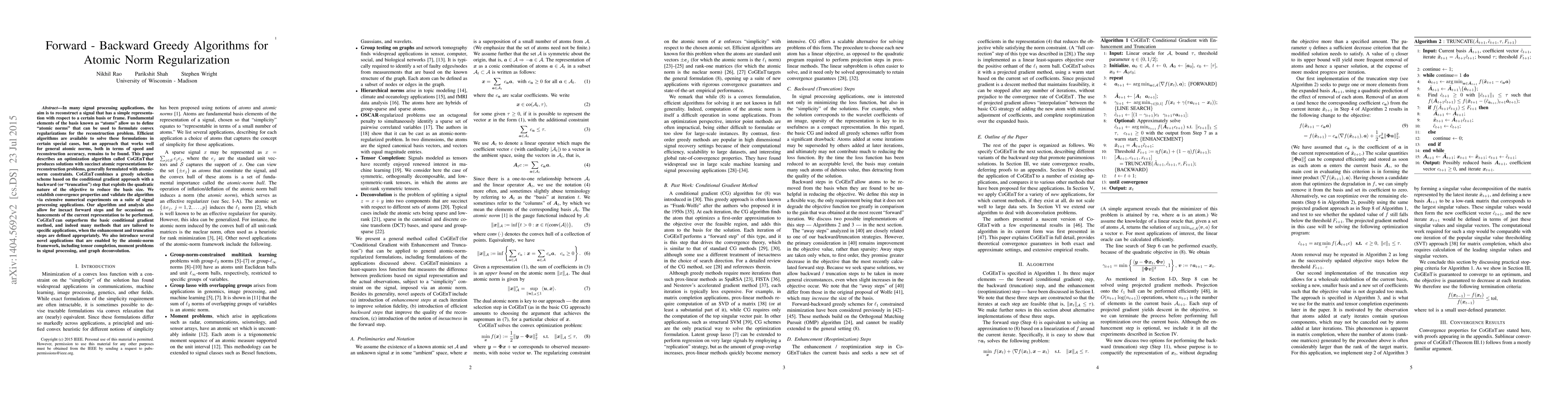This paper introduces CoGEnT, a forward-backward greedy algorithm for atomic norm regularization, combining conditional gradient selection with a backward truncation step to enhance both speed and accuracy in reconstruction problems. The algorithm outperforms basic methods and enables novel applications like tensor completion and graph deconvolution.