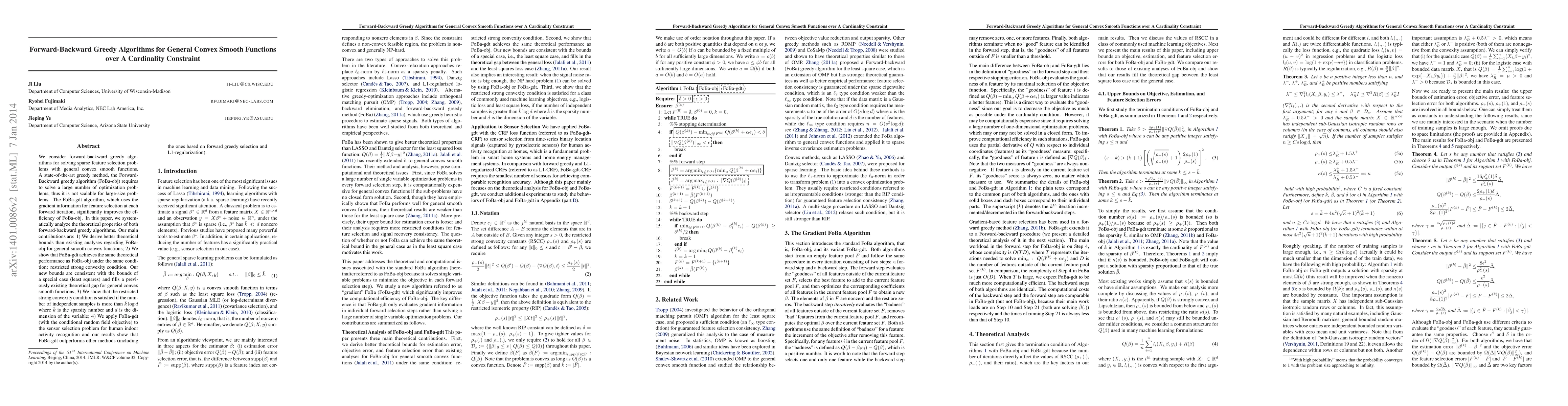 This paper analyzes forward-backward greedy algorithms for sparse feature selection with general convex smooth functions, proposing FoBa-gdt which uses gradient information to improve efficiency. The authors derive better theoretical bounds for FoBa-obj, show FoBa-gdt's equivalence to FoBa-obj under restricted strong convexity, and demonstrate its effectiveness in sensor selection for human activity recognition.