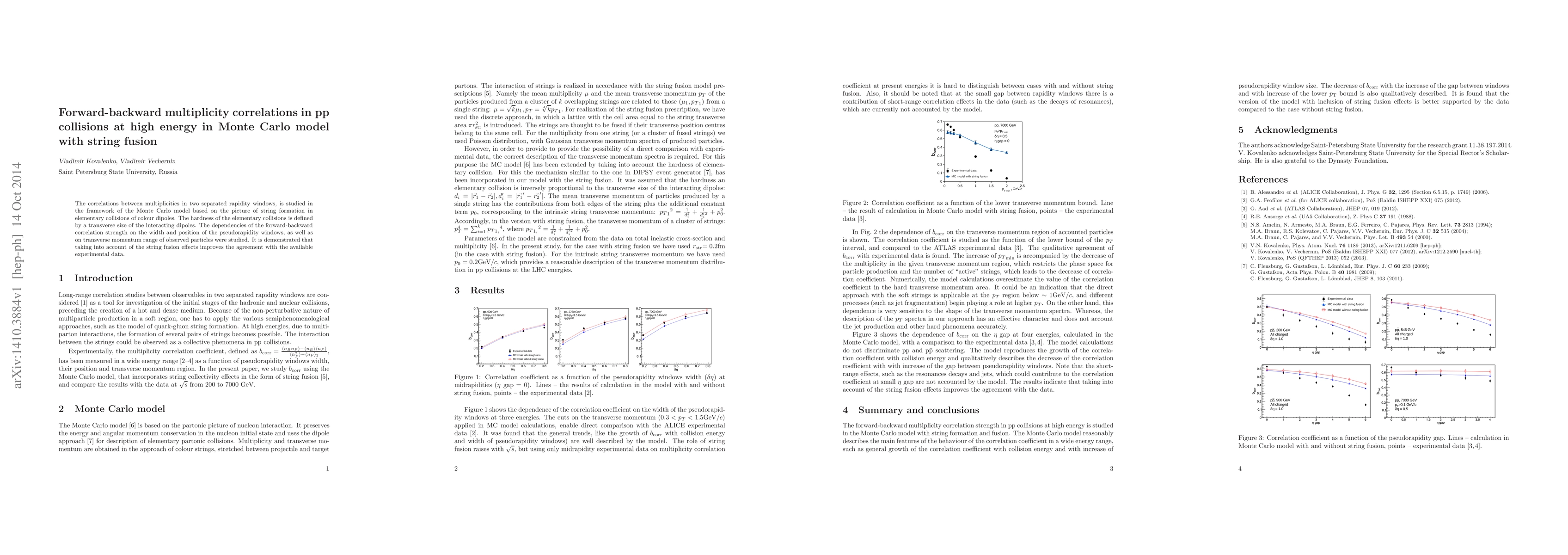 This study investigates correlations between multiplicities in two rapidity windows in high-energy proton-proton collisions using a Monte Carlo model incorporating string fusion. The model's accuracy improves when string fusion effects are considered, better matching experimental data.