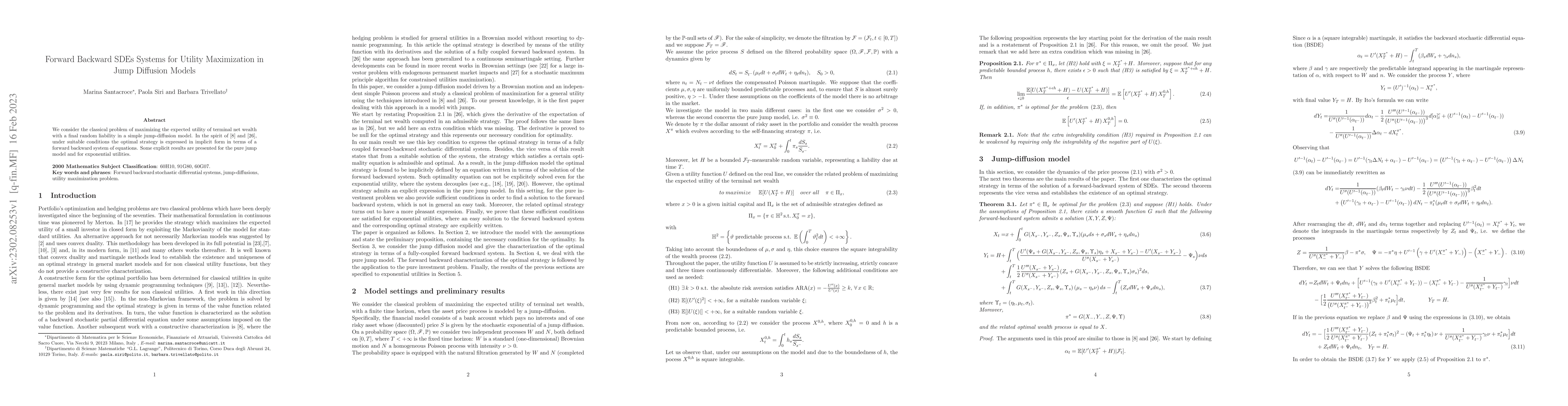 This paper explores utility maximization in jump-diffusion models using forward backward stochastic differential equations (SDEs). The optimal strategy is derived implicitly through a forward backward SDE system, with explicit results for pure jump models and exponential utilities.