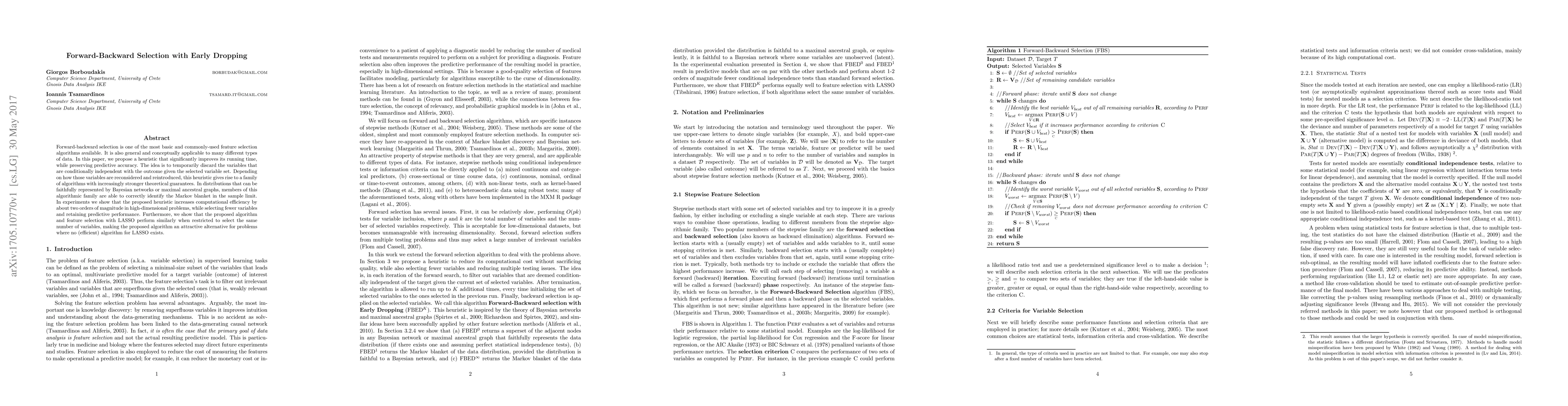 Forward-backward selection is one of the most basic and commonly-used feature selection algorithms available. It is also general and conceptually applicable to many different types of data. In this paper, we propose a heuristic that significantly improves its running time, while preserving predictive accuracy. The idea is to temporarily discard the variables that are conditionally independent with the outcome given the selected variable set. Depending on how those variables are reconsidered and reintroduced, this heuristic gives rise to a family of algorithms with increasingly stronger theoretical guarantees. In distributions that can be faithfully represented by Bayesian networks or maximal ancestral graphs, members of this algorithmic family are able to correctly identify the Markov blanket in the sample limit. In experiments we show that the proposed heuristic increases computational efficiency by about two orders of magnitude in high-dimensional problems, while selecting fewer variables and retaining predictive performance. Furthermore, we show that the proposed algorithm and feature selection with LASSO perform similarly when restricted to select the same number of variables, making the proposed algorithm an attractive alternative for problems where no (efficient) algorithm for LASSO exists.